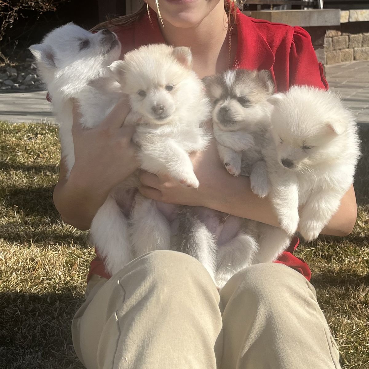 These little adorable fluff balls are working on potty training and sitting. Pomsky are fun, loving and a very smart breed; which makes them easier to train.