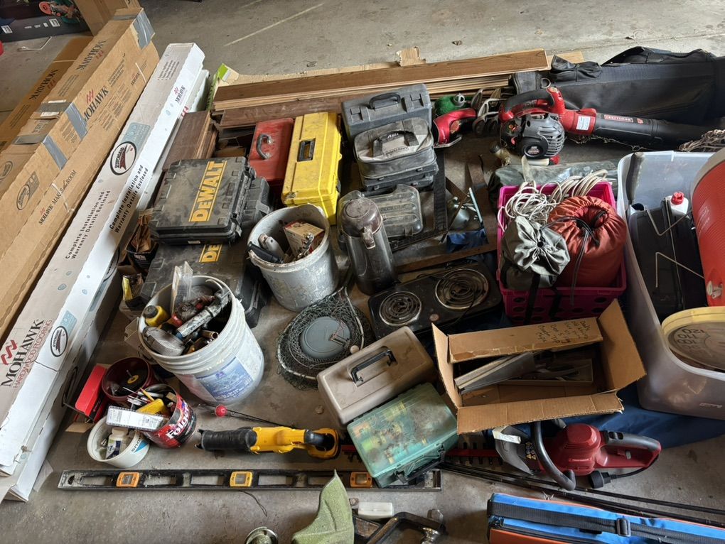 Items include: •Pool table •Multiple TVs •Artwork •A large collection of tools •Several snow blowers and lawn mowers •Power tools and ladders •Furniture and desks