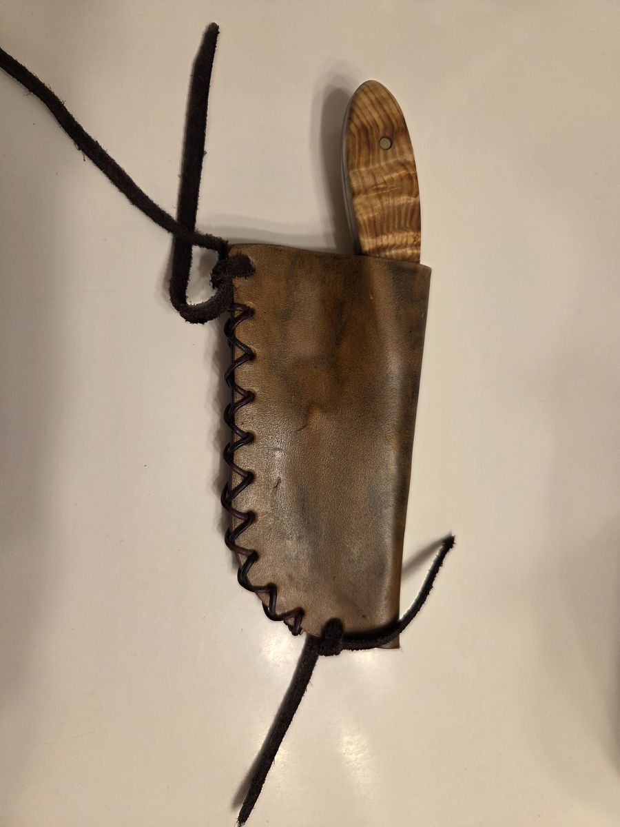 VenmoSkinner style knife made with high carbon steel blade, tempered and hardened for strength and flexability. Knife is 6 inches long with a 3 inch blade. Comes with scabbard.