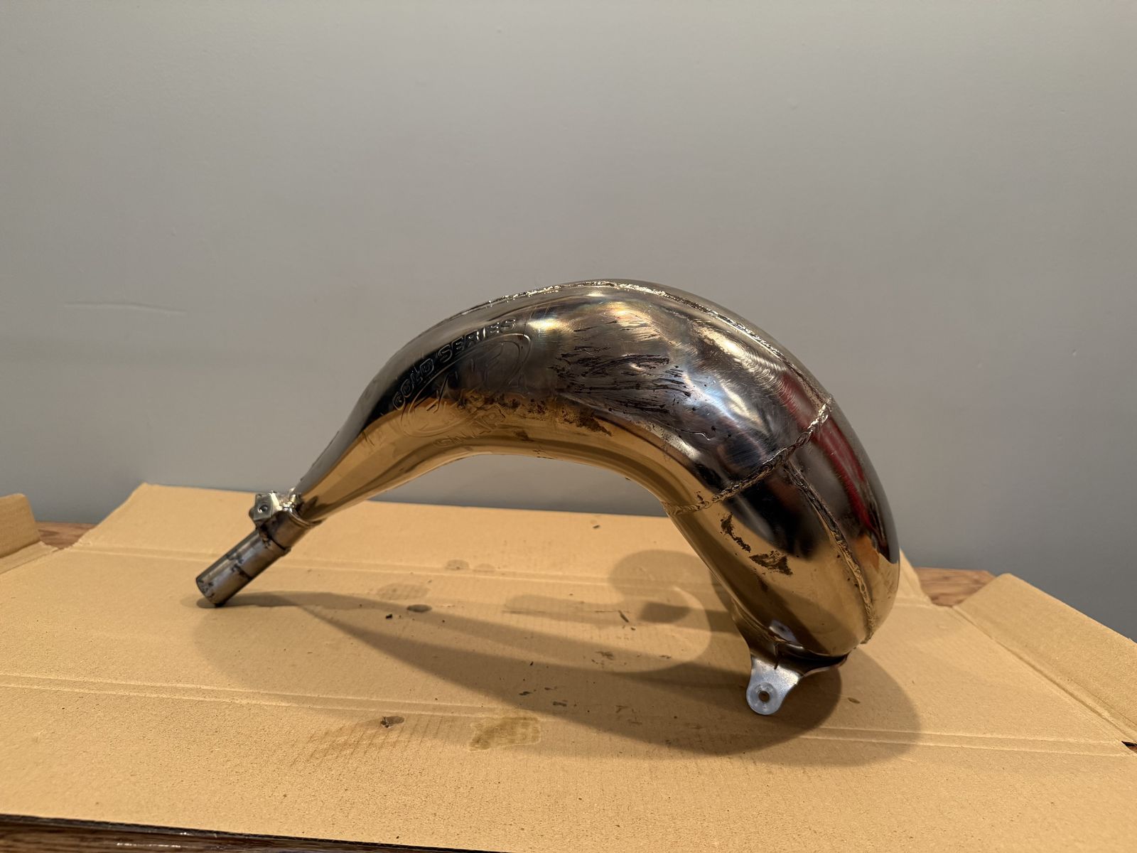 VenmoGreat quality FMF Gnarly Torque pipe. I've had this on my 2015 Beta 300RR and have loved it. No major damage, just small scratches from regular use. Not abused. Definitely improves low end grunt and comes with a carbon fiber pipe guard that has been Rhino lined. No o-rings. Dark marks on pipe are from the pipe guard.