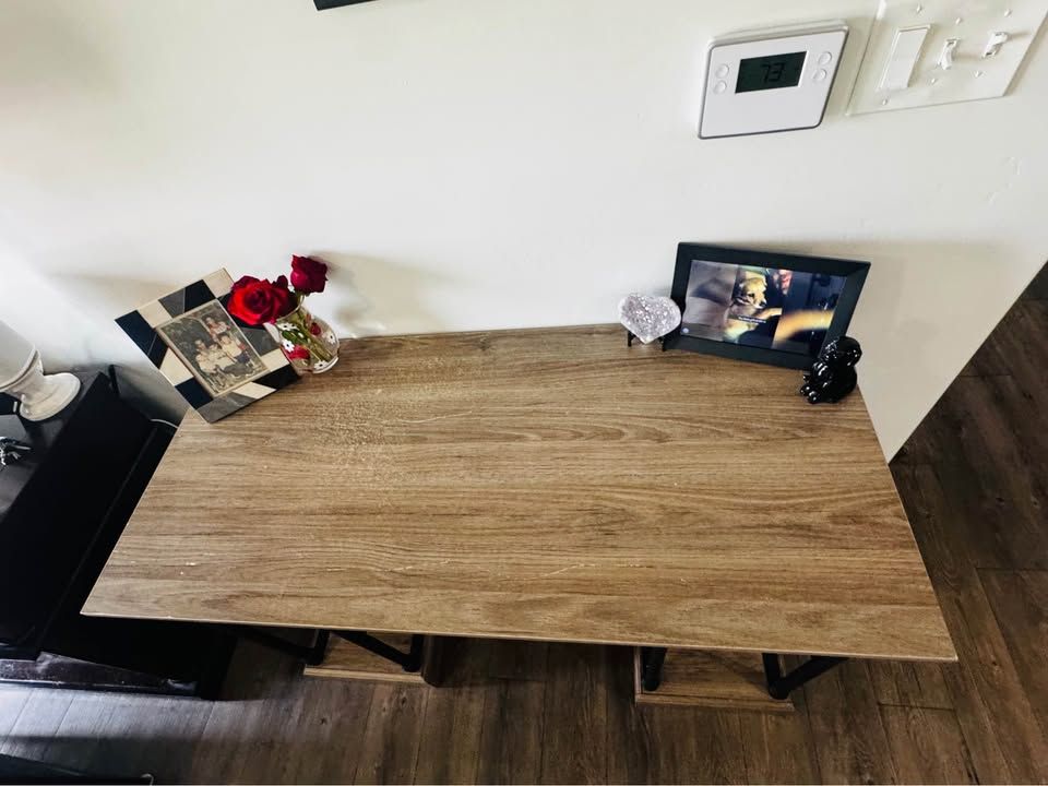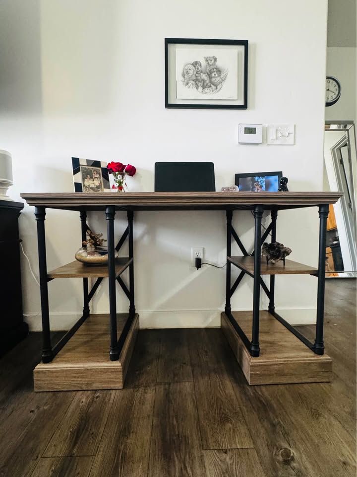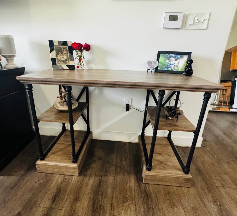 ApplePay• 4-shelf desk lends functional flair to your space • Cast-iron accents create cool contrast • 4 open shelves easily store supplies, documents and other essentials • Simple design blends effortlessly with any decor style • The space between the shelving is 20 inches • Metal tubbing