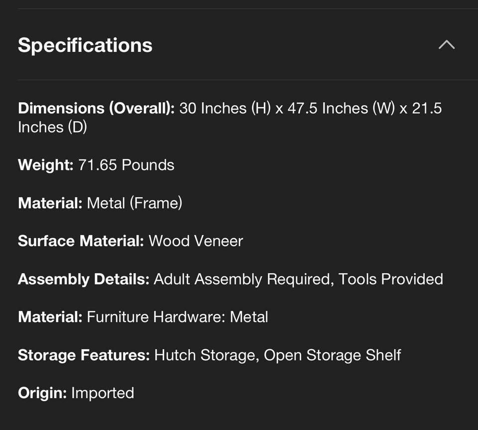 DIMENSIONAL DETAILS Overall width: 47.5 inches Overall depth: 21.5 inches Overall height with floor protector: 30.25 inches Overall height without floor protector: 30 inches Storage shelf width: 11.5 inches Storage shelf depth: 16.75 inches Storage shelf inner space: 11.75 inches Width between side metal frames: 9.125 inches Middle space between two bases: 20 inches Height from the bottom of desk top to the floor: 28.125 inches