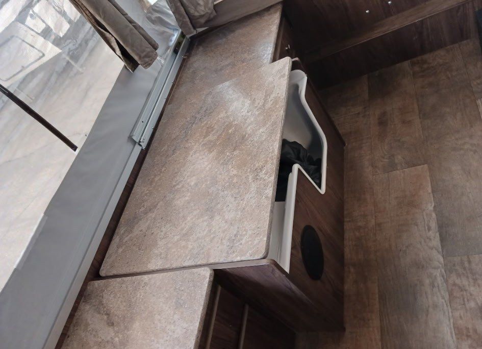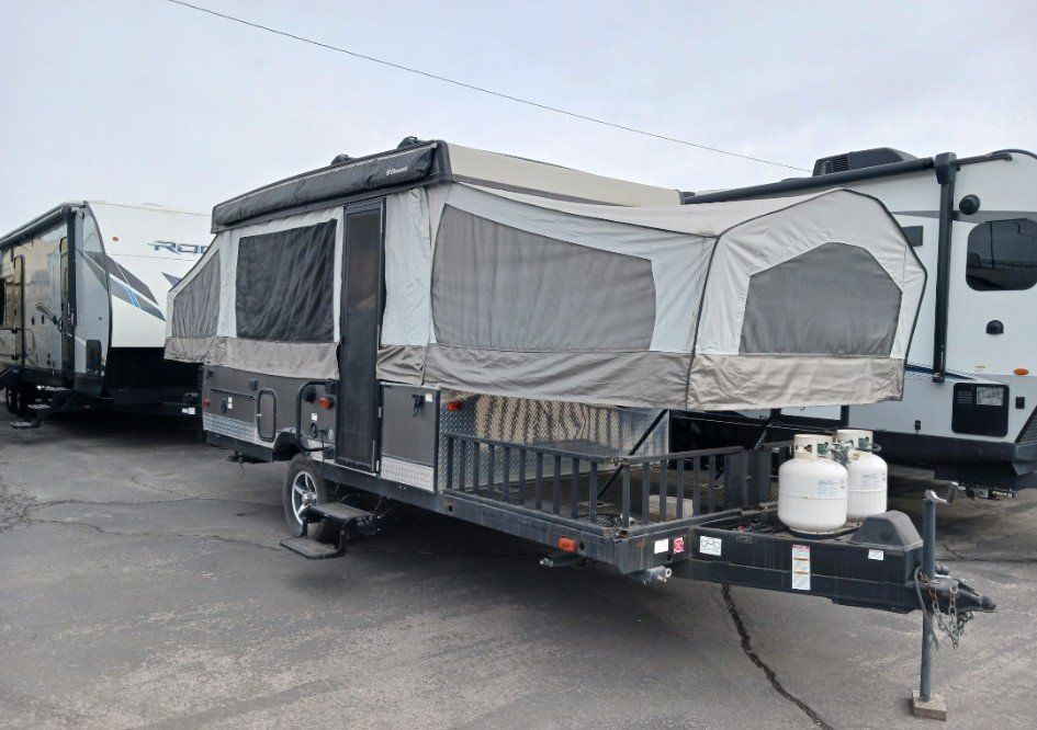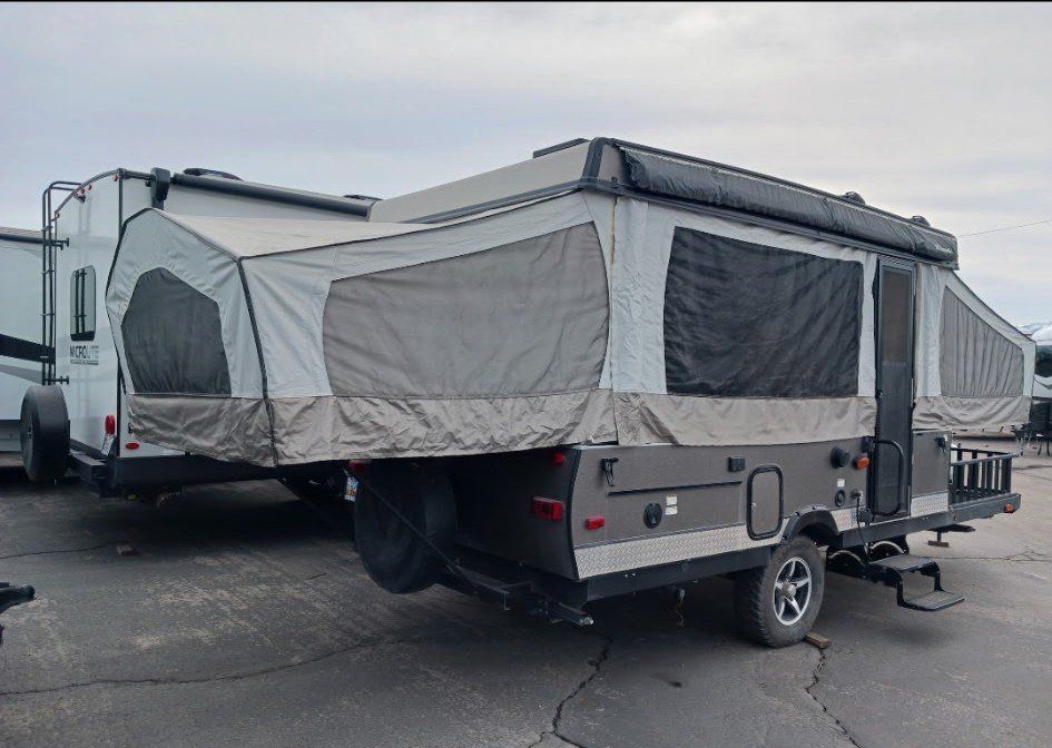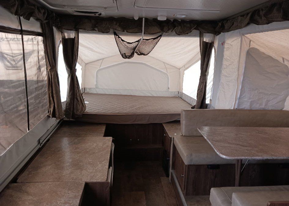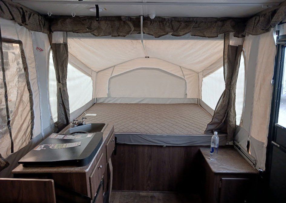 We have loved using this little camper but switched up our 4 wheeler for a side by side so it doesn't fit on the trailer anymore. It has a fully functional stove fridge sink. One heated king bed, one heated queen and one twin/smaller bed that the table converts to. Lots of storage above and below benches beds etc. The switch does have a hard time sometimes to pop it up but that's about it :)