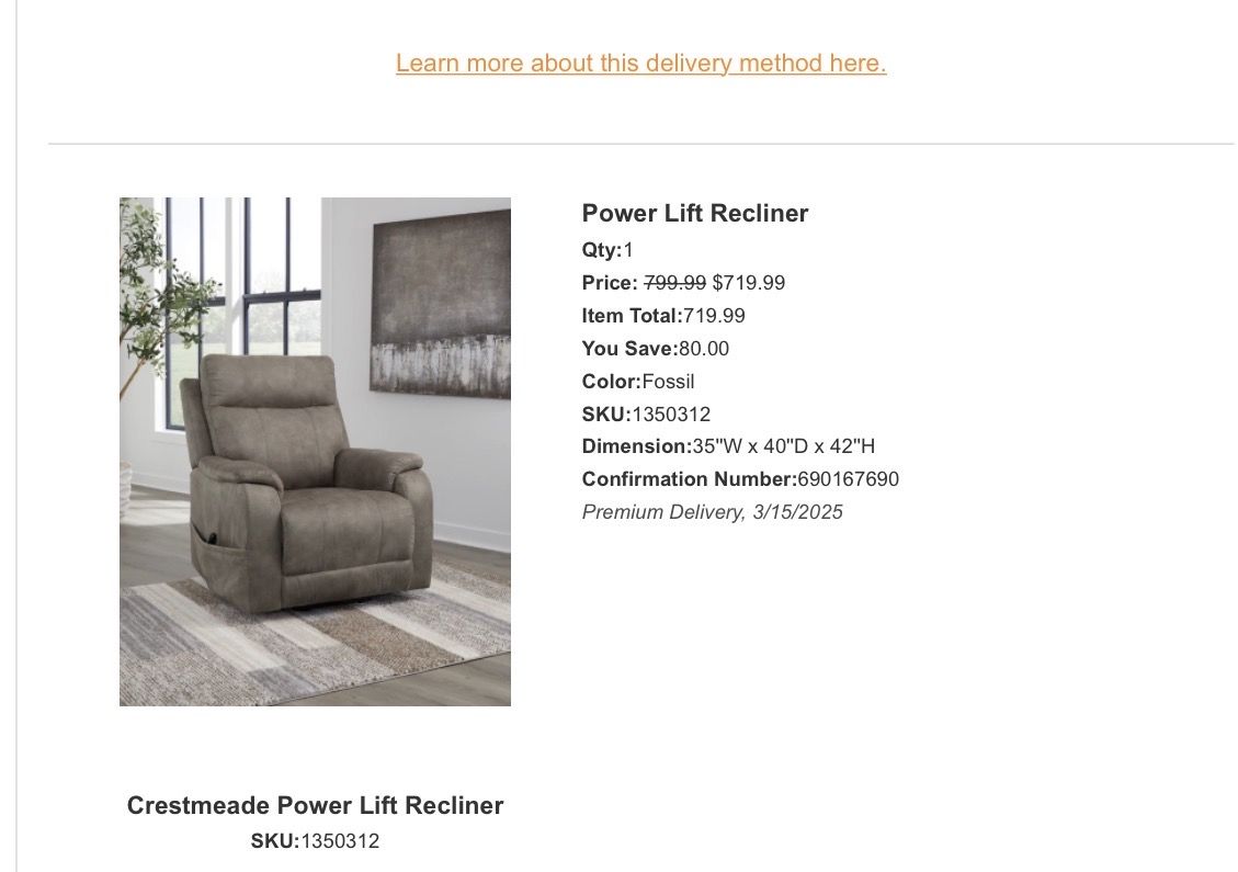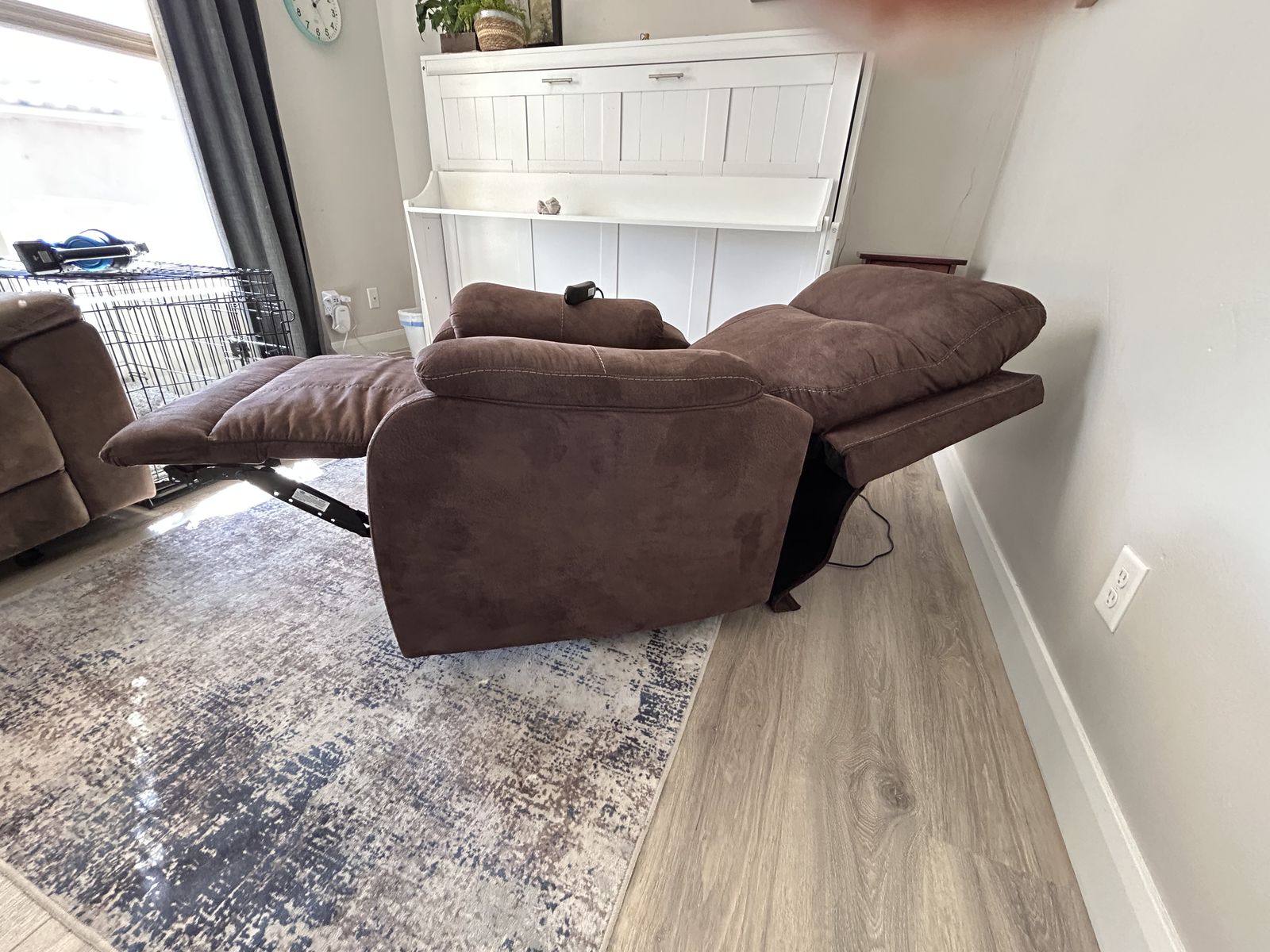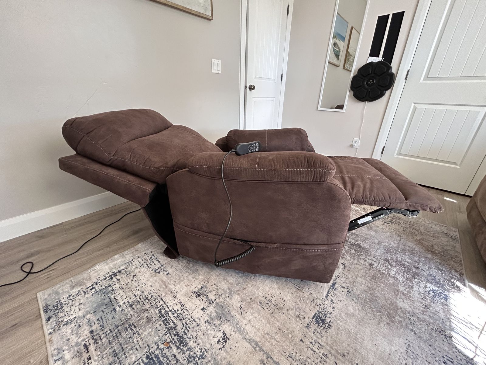 CashAppOBO Like new!! Brown lift chair from Ashley furniture - less than a year old. Has high and low heat - high, medium and low massage. 35W x 40D x 42H Refer to the video to see how it operates. So easy and was perfect for my mom. We had a waterproof fabric protector on it so there are no spills or stains. Perfect for the elderly or anyone needing an assist getting out of a chair Non smoking home There is a hypoallergenic dog in the home