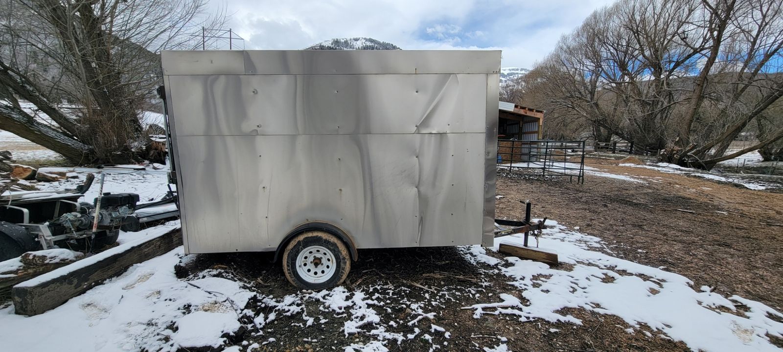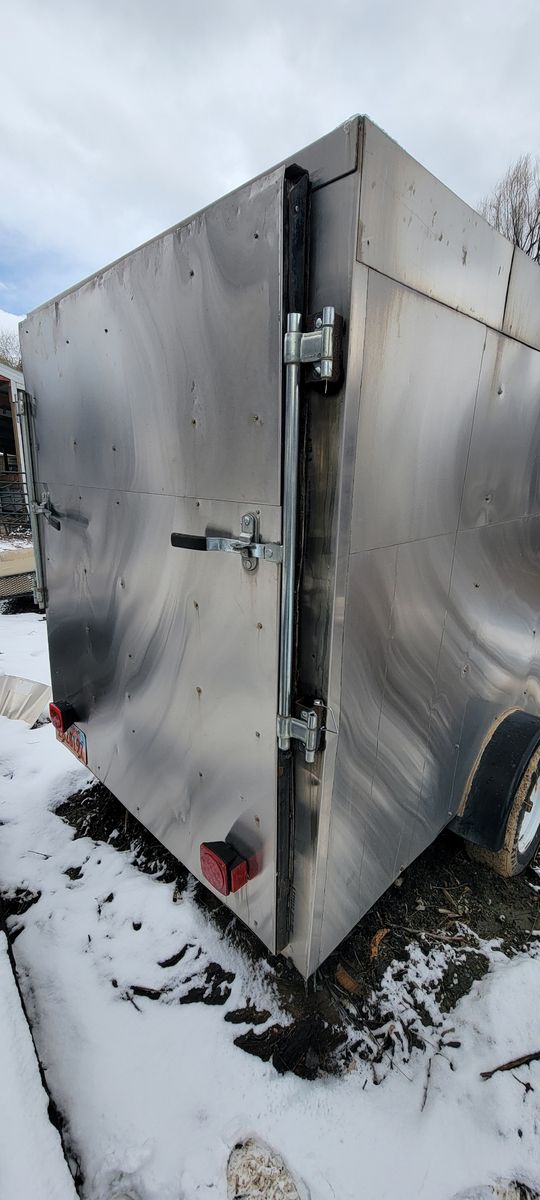 Stainless Steel outside. Works and pulls great, tires are in good shape. Drop down rear door with lift assist.