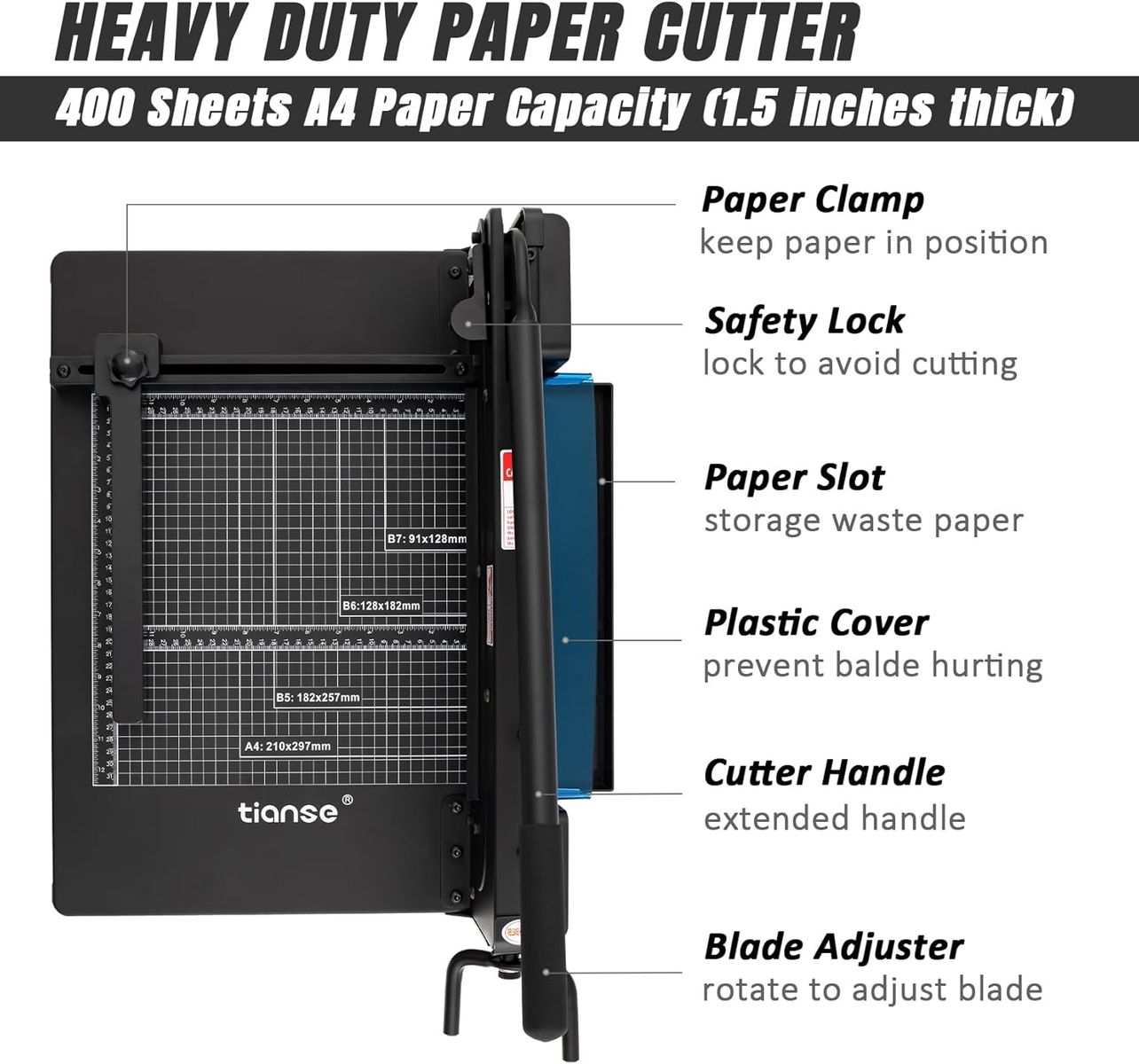 400 Sheet High Capacity : With texting the heavy duty paper cutter maximum cutting capacity : 400 Sheets 2.5 oz A4 Paper about 1.5 inch thick; Adjustable pressure clamps for balanced stress on paper that avoids paper moving when cutting multiple sheets. Notes: please use scrap paper on the front page to prevent indentations on the paper