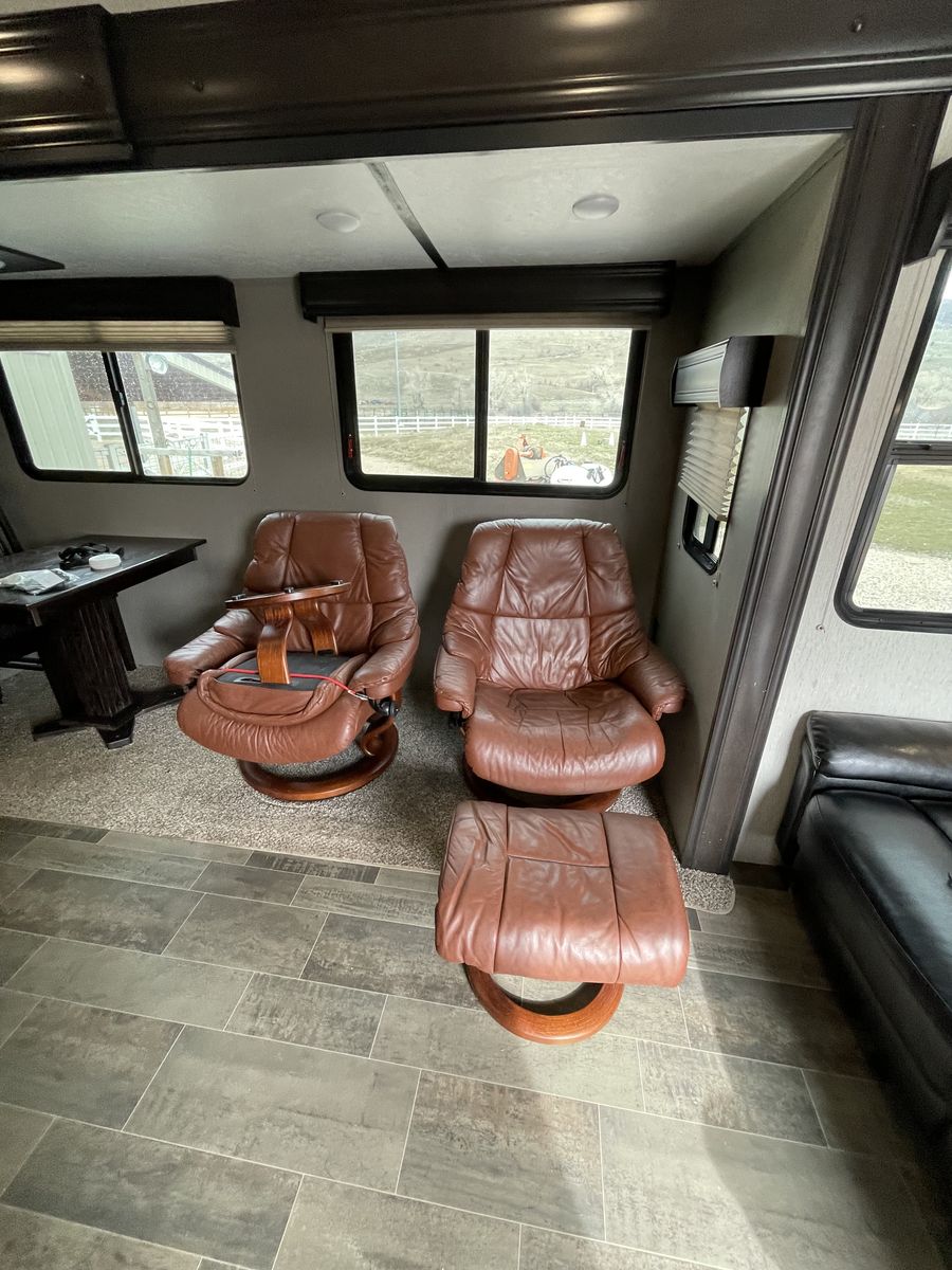 *Queen size bed, foldout love-seat, 2 reclining leather chairs w/ottomans