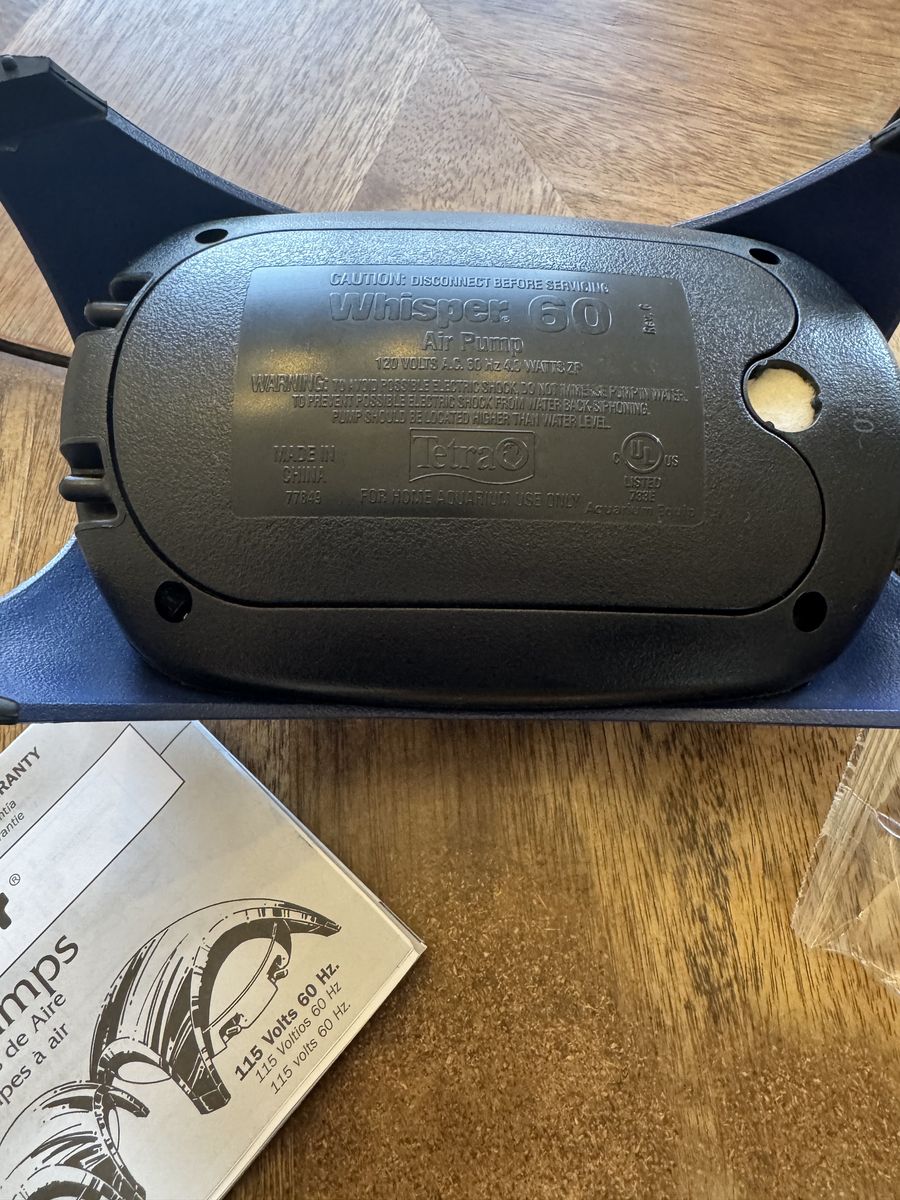 ZelleLike new, I just don’t need this one anymore. Rated for supporting a 60 gallon aquarium with dual air outputs. The best part about these air pumps are THEY ARE QUIET! I can’t stand listening to aquarium equipment all day. This is mounted permanently on rubber feet, and solid construction make the sound unnoticeable, especially when isolated below/behind your aquarium. $35 at PetCo.