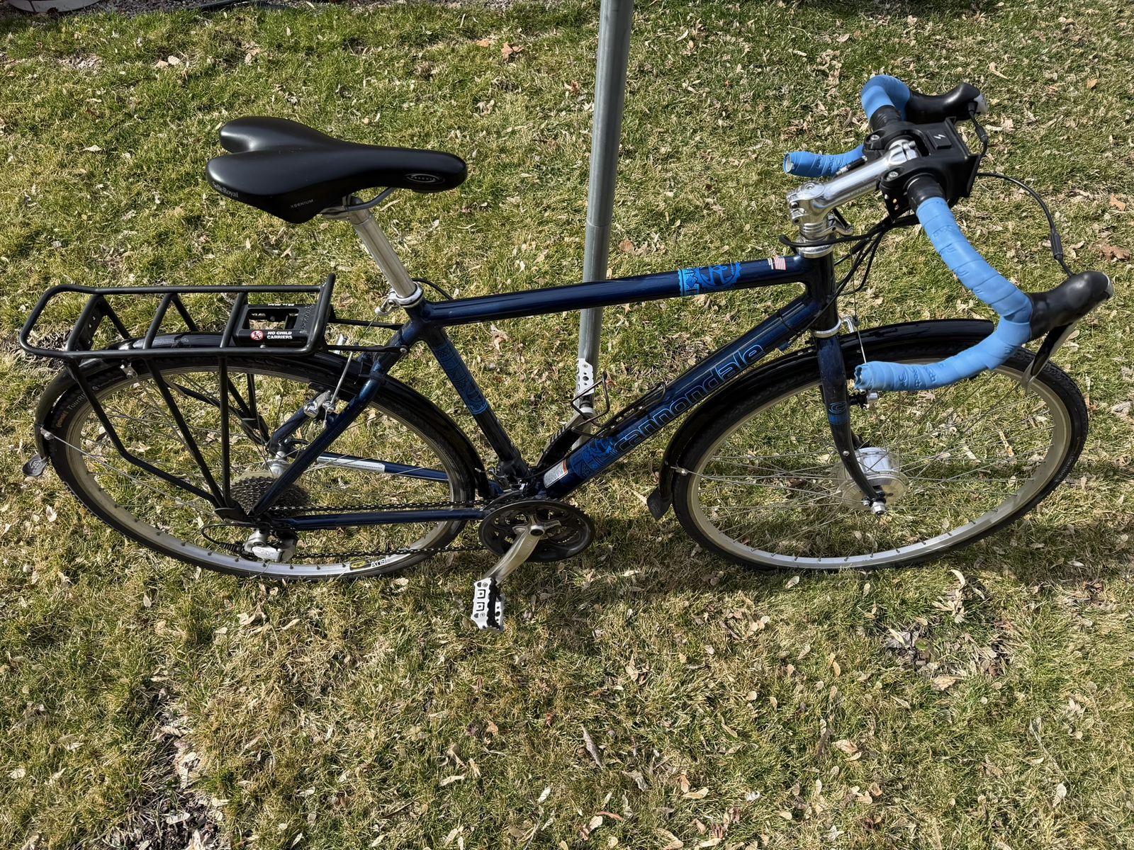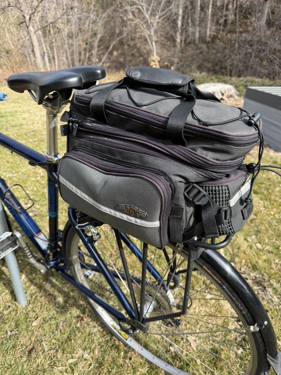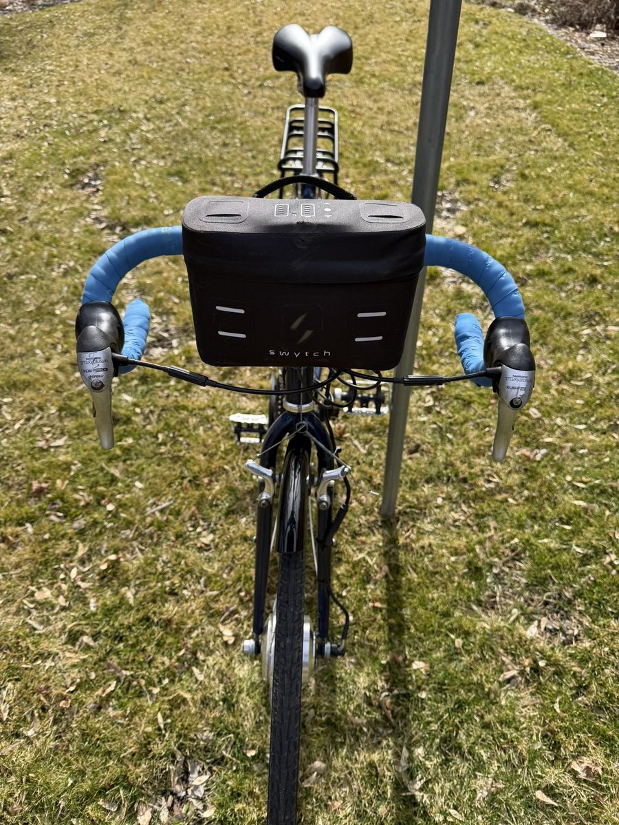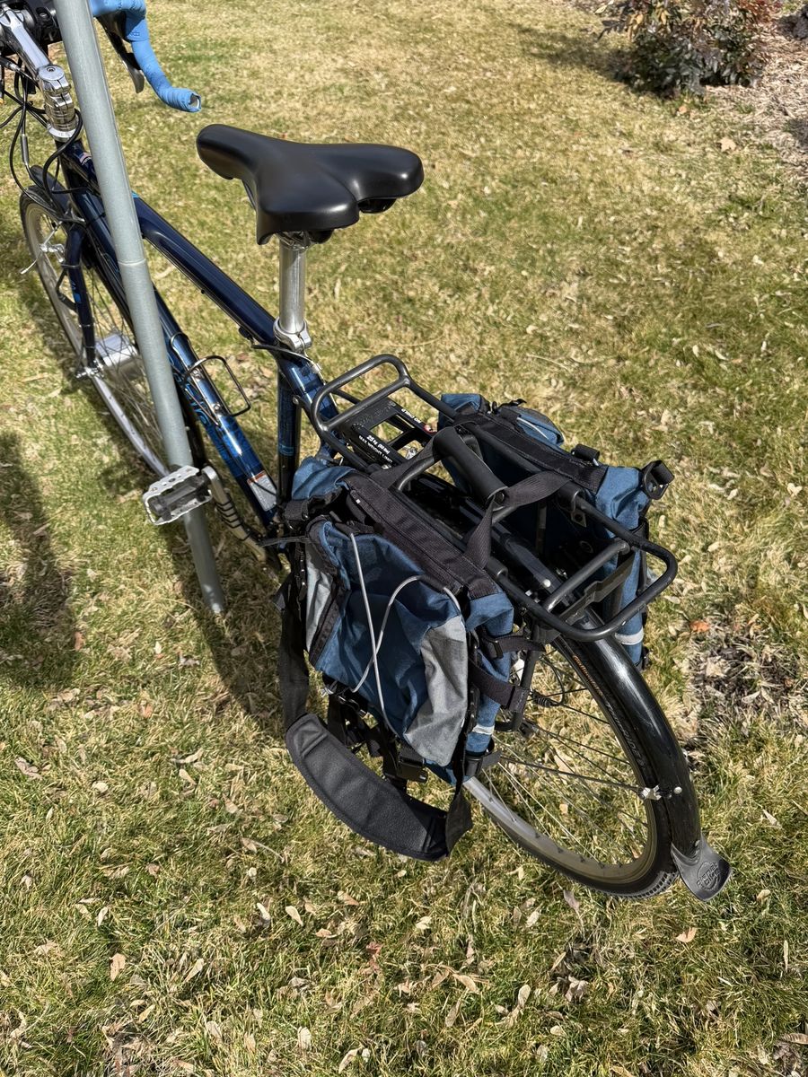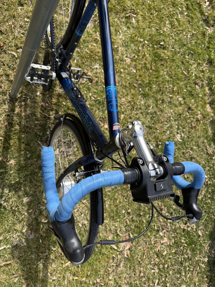 PayPalWell-but-wisely-used Cannondale drop-bar touring bike. The real deal that they don’t make anymore. Aluminum frame, 21” seat tube, and 700 x 32C tires. The Cadillac El Dorado of bicycles. Long and low for a stable ride when fully loaded. Shimano derailleur. Heavy-duty caliper brakes. Eighteen gears, lowest is 1:1. Will carry you and 100 lbs. of cargo up a barn roof. Comes with: Front and rear racks and matching panniers; a rear trunk bag with droppable mini-panniers; a Swytch front-hub electric assist system with a 22+-mile range, together the original front wheel. Lots of brazed-on connections for bottles, racks, and bags. Full-coverage front and rear fenders. In addition to its touring bones, makes a great commuter bike. Everything needed to get into serious bikepacking.