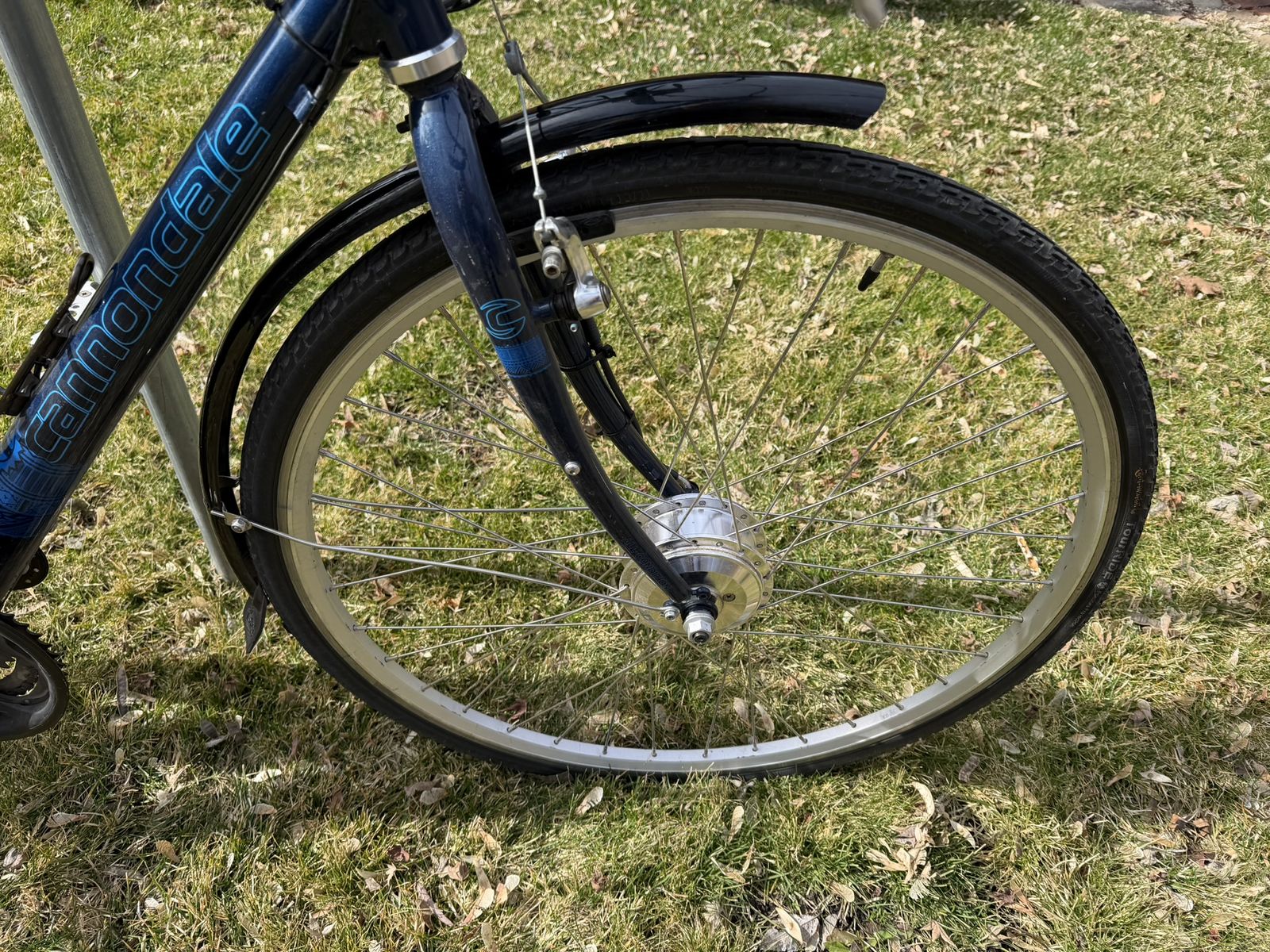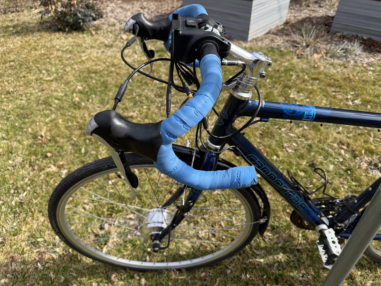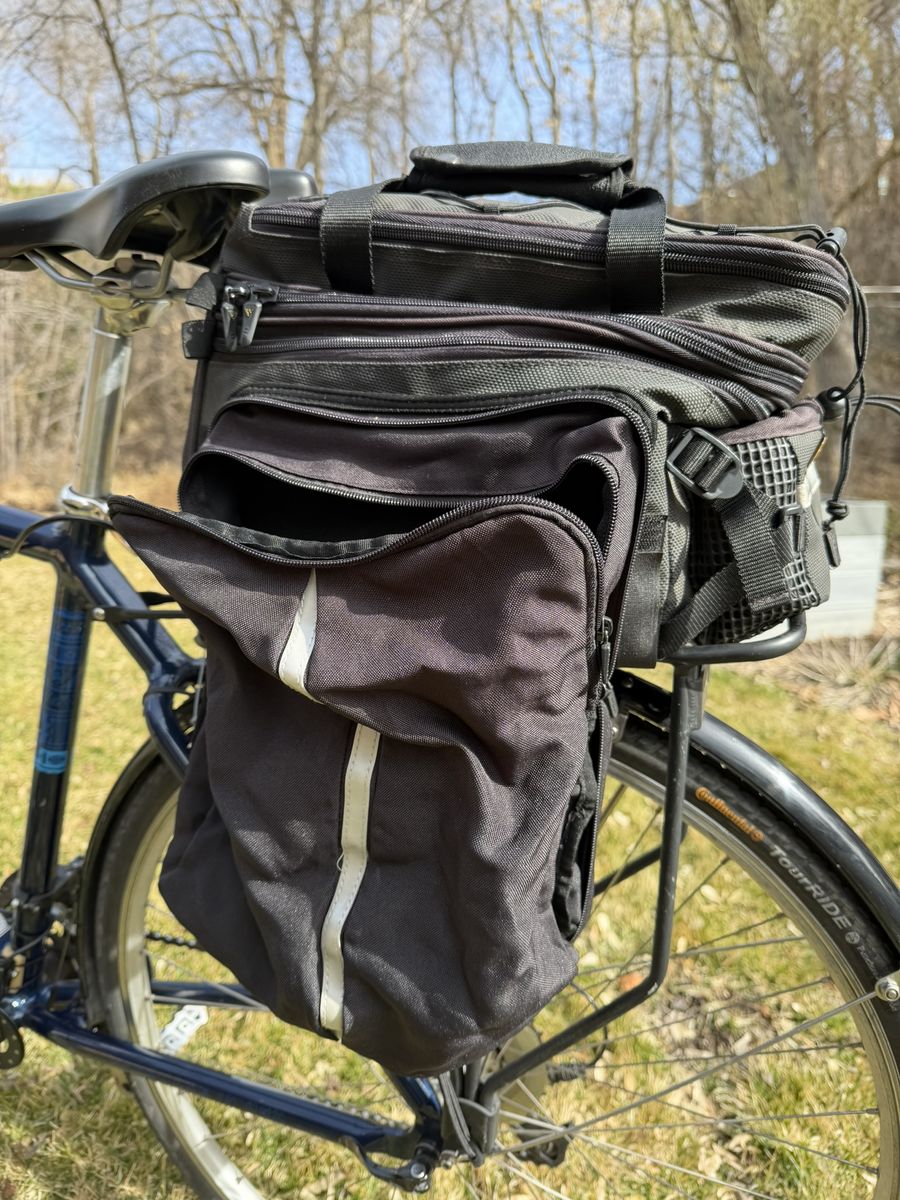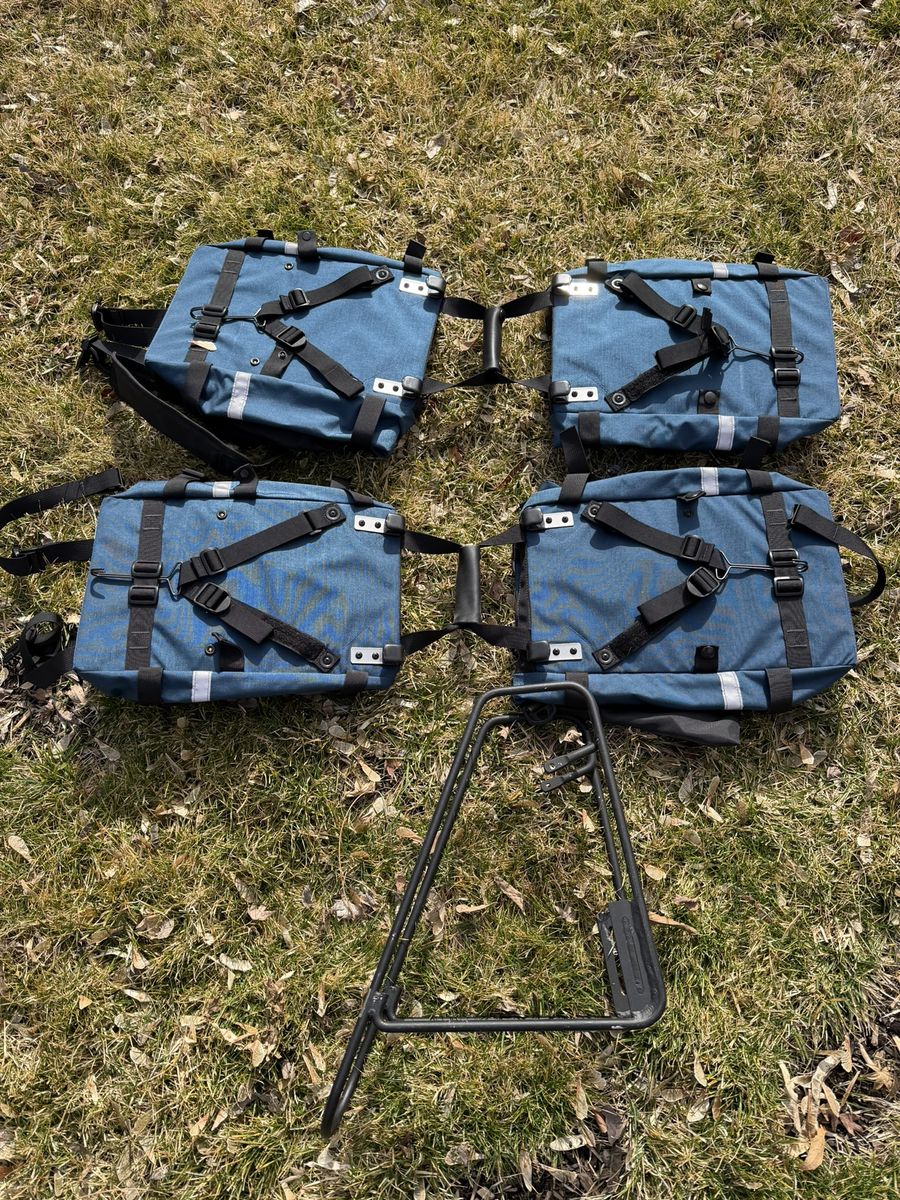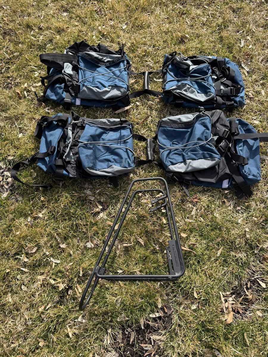 PayPalWell-but-wisely-used Cannondale drop-bar touring bike. The real deal that they don’t make anymore. Aluminum frame, 21” seat tube, and 700 x 32C tires. The Cadillac El Dorado of bicycles. Long and low for a stable ride when fully loaded. Shimano derailleur. Heavy-duty caliper brakes. Eighteen gears, lowest is 1:1. Will carry you and 100 lbs. of cargo up a barn roof. Comes with: Front and rear racks and matching panniers; a rear trunk bag with droppable mini-panniers; a Swytch front-hub electric assist system with a 22+-mile range, together the original front wheel. Lots of brazed-on connections for bottles, racks, and bags. Full-coverage front and rear fenders. In addition to its touring bones, makes a great commuter bike. Everything needed to get into serious bikepacking.
