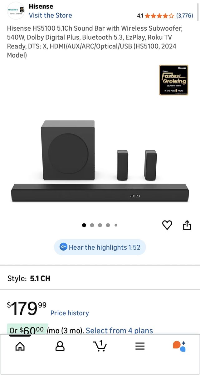 VenmoHisense HS5100 5.1Ch Sound Bar with Wireless Subwoofer – 2024 Model