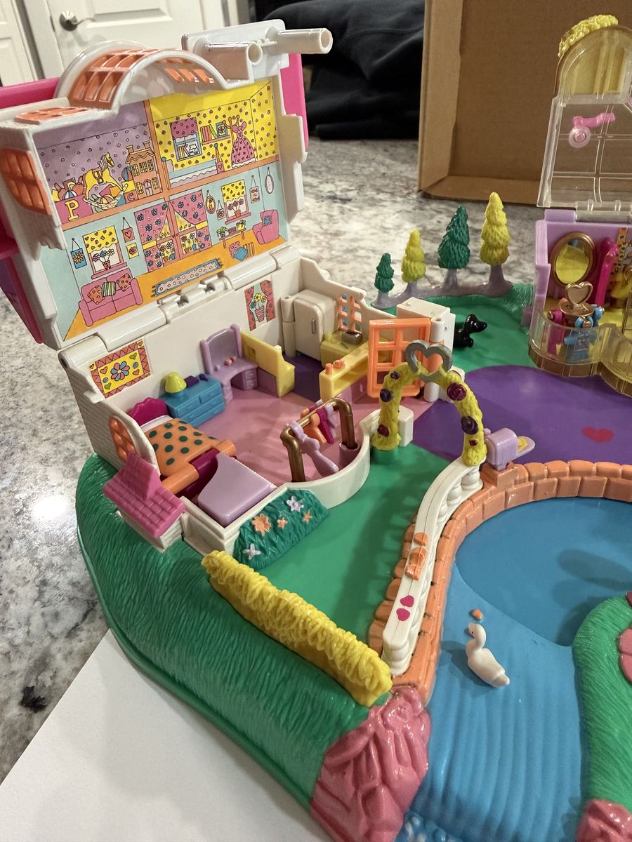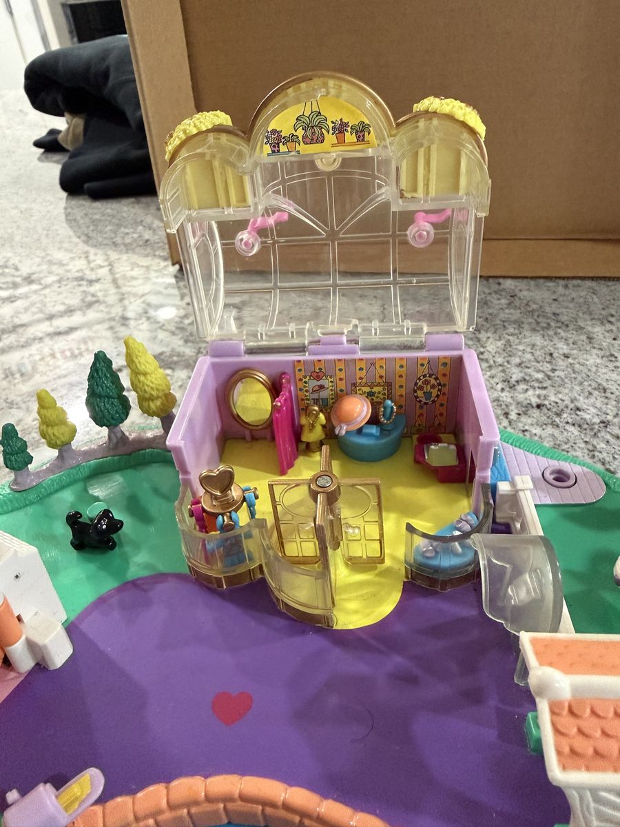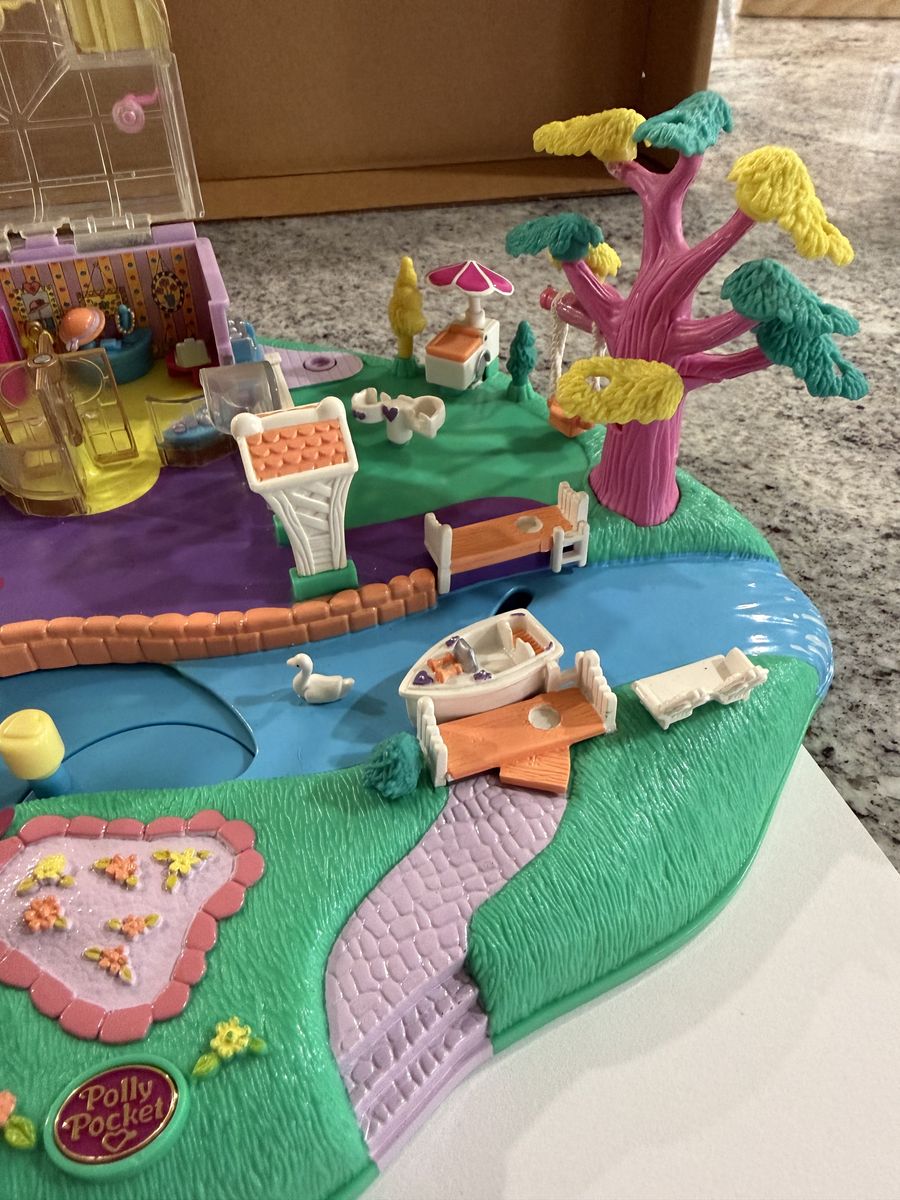 ZelleThis is a RARE COMPLETE Polly pocket playset. No signs of wear apart from the flags on the boutique look like they may have been bent at the base but it is hidden once they are inserted into the roof.