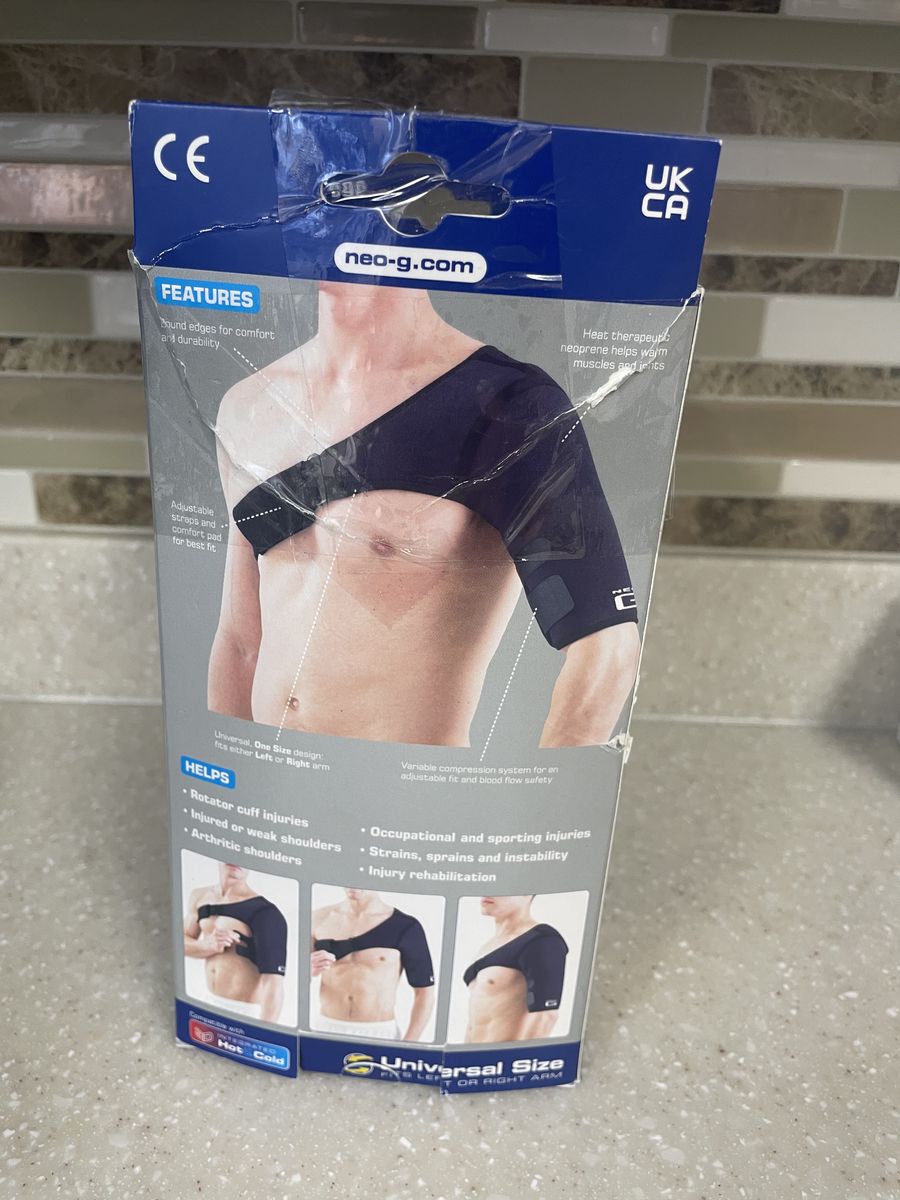 VenmoNeo G Easy-Fit Shoulder Support, a Class 1 Medical Device designed to provide support and compression for injuries like rotator cuff issues, strains, and sprains. • Adjustable Fit: Features adjustable straps to provide customized compression and support for both the left and right shoulder. • Material: Constructed from heat therapeutic neoprene, which helps keep the shoulder warm to manage pain and stiffness. • Design: Designed for moderate support while allowing movement, suitable for daily wear under clothing. • Price: Typically retails for approximately 1$45.99. *****The packaging is a little tough, but the product is brand new!!