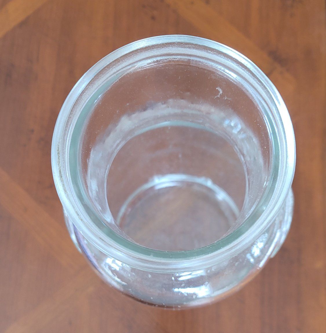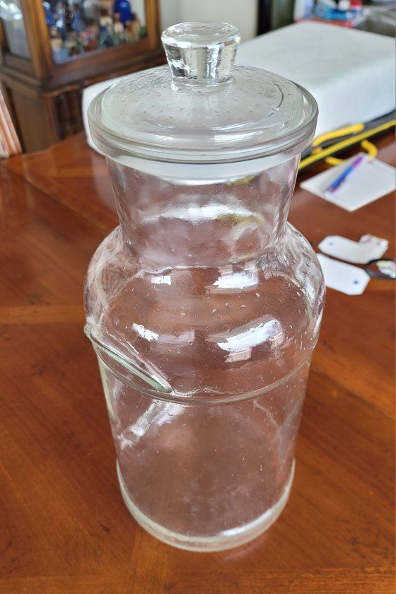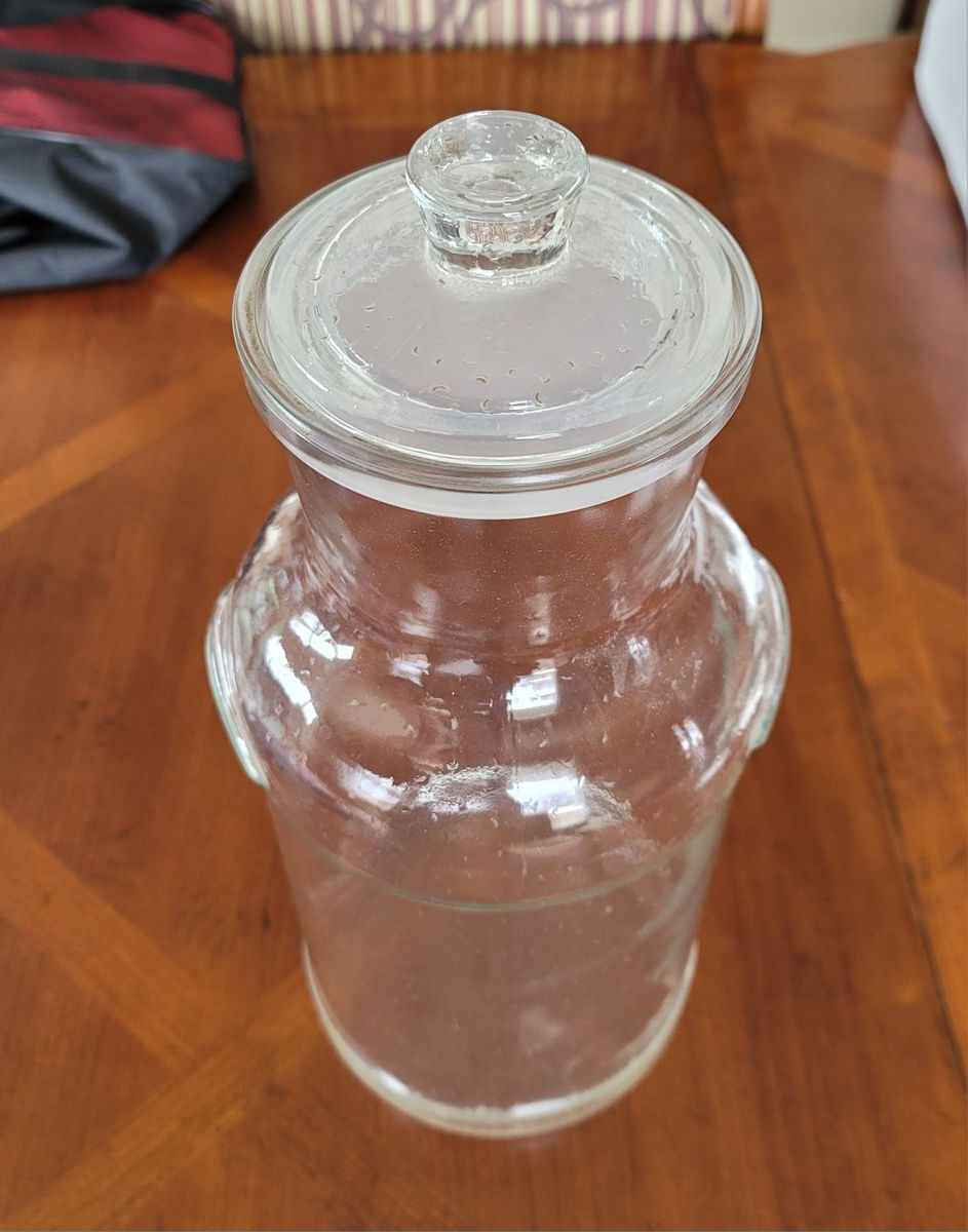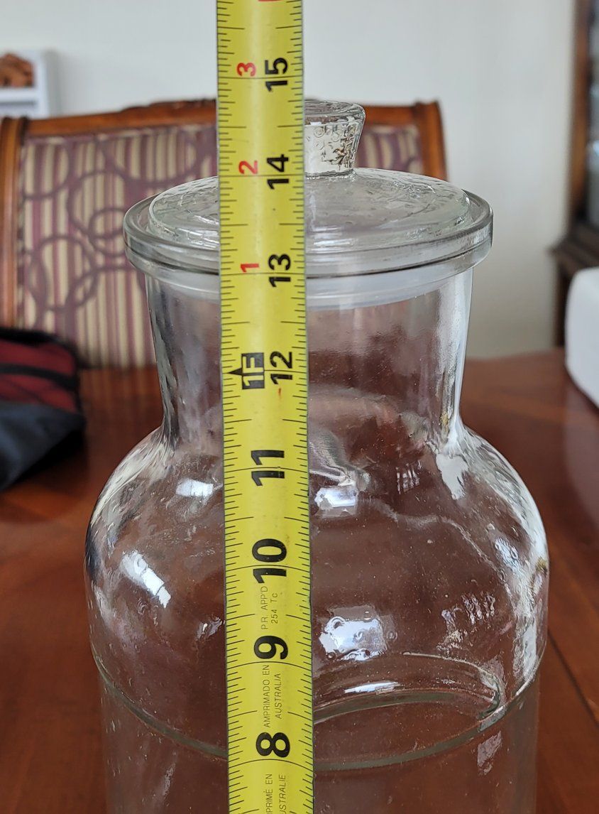 PayPalI am selling a really neat vintage, glass canister. This piece has no markings that I can find but is kind of a dented texture glass look (looks like small speckles in pictures) with two handles, two small feet and lid with sealing plastic insert. I have had this for many years on display and various uses, it's a fun item to own with lots of possibilities. Seal is not air tight, but is clean and intact. No chips or cracks. Has about 4 inch top opening and stands just over 14 inches tall.