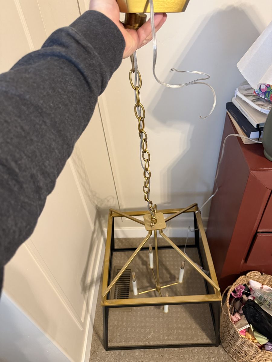 ApplePayBlack and good chandelier. It’s 4 lights and is 30 inches tall and 22 inches wide and deep. Hung with a chain.