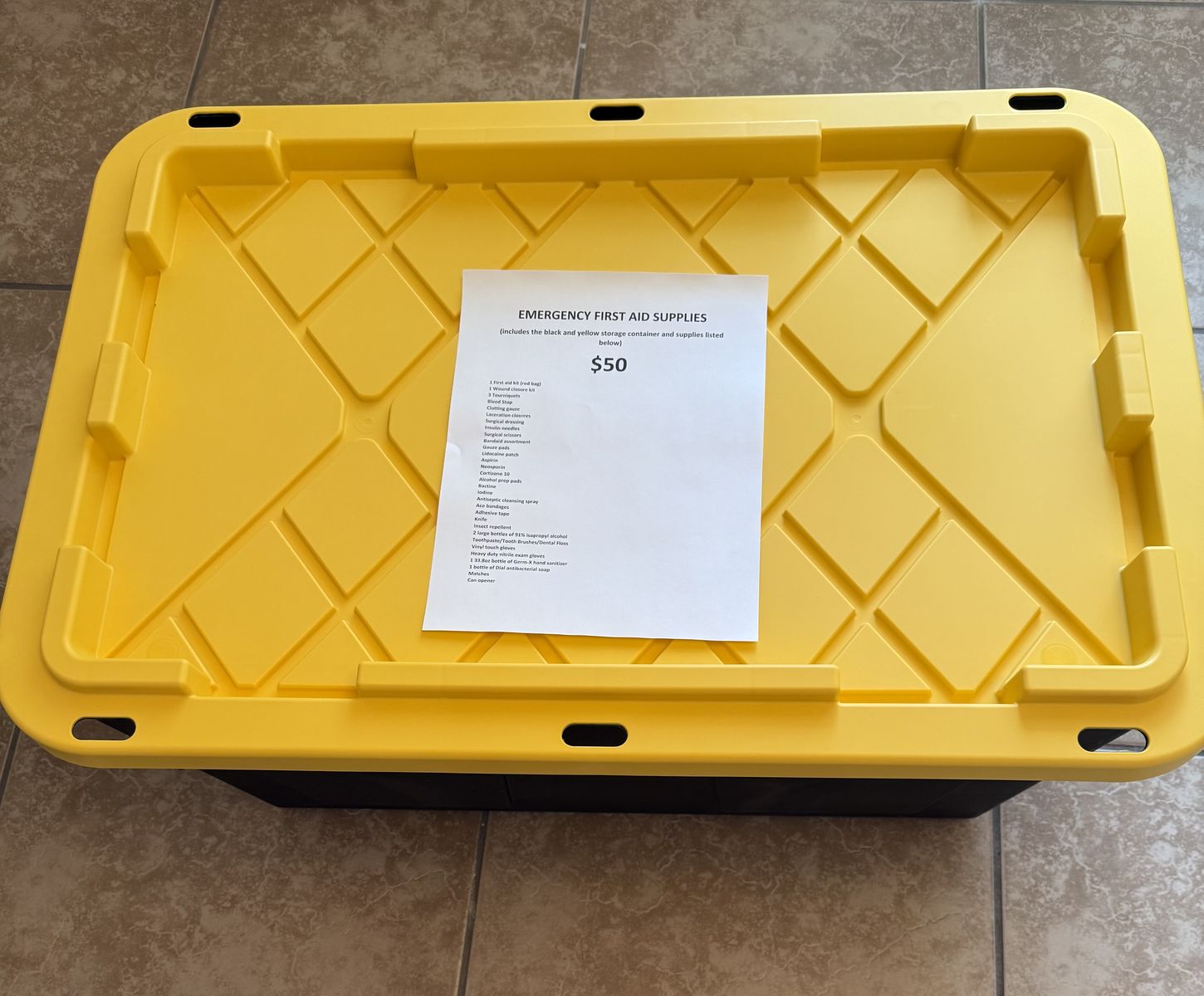 First Aid & Emergency Supplies. Includes the black and yellow storage tub and items listed below: