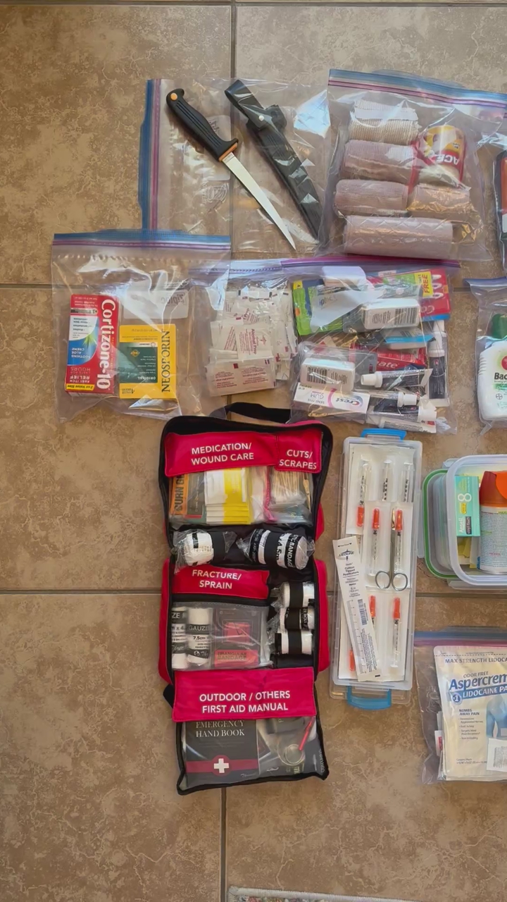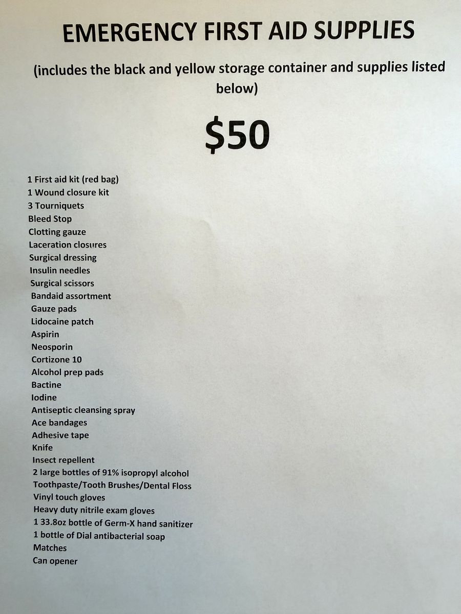 1 complete first aid kit (red bag) 1 Wound closure kit 3 Tourniquets Bleed Stop Clotting gauze Laceration closures Surgical dressing Insulin needles Surgical scissors Bandaid assortment Gauze pads Lidocaine patch Aspirin Neosporin Cortizone 10 Alcohol prep pads Bactine Iodine Antiseptic cleansing spray Ace bandages Adhesive tape Knife Insect repellent 2 large bottles of 91% isopropyl alcohol Toothpaste/Tooth Brushes/Dental Floss Vinyl touch gloves Heavy duty nitrile exam gloves 1 33.8oz bottle of Germ-X hand sanitizer 1 bottle of Dial antibacterial soap Matches Can opener