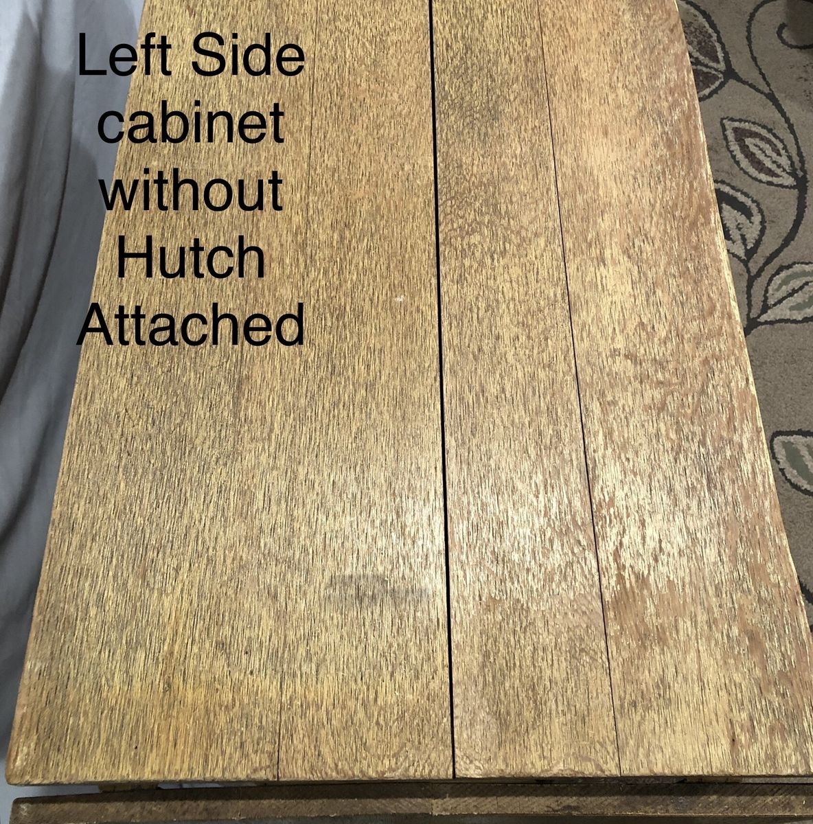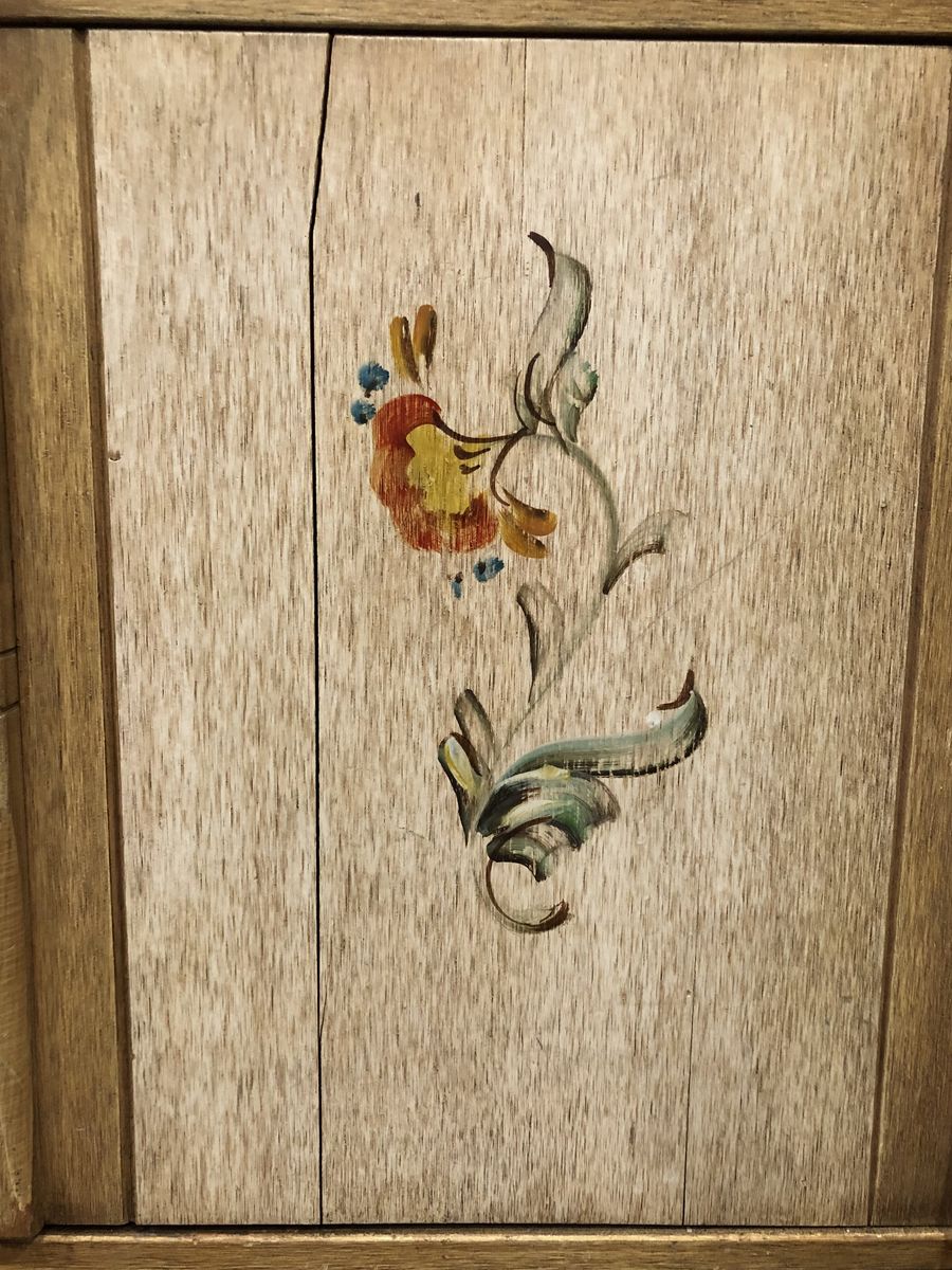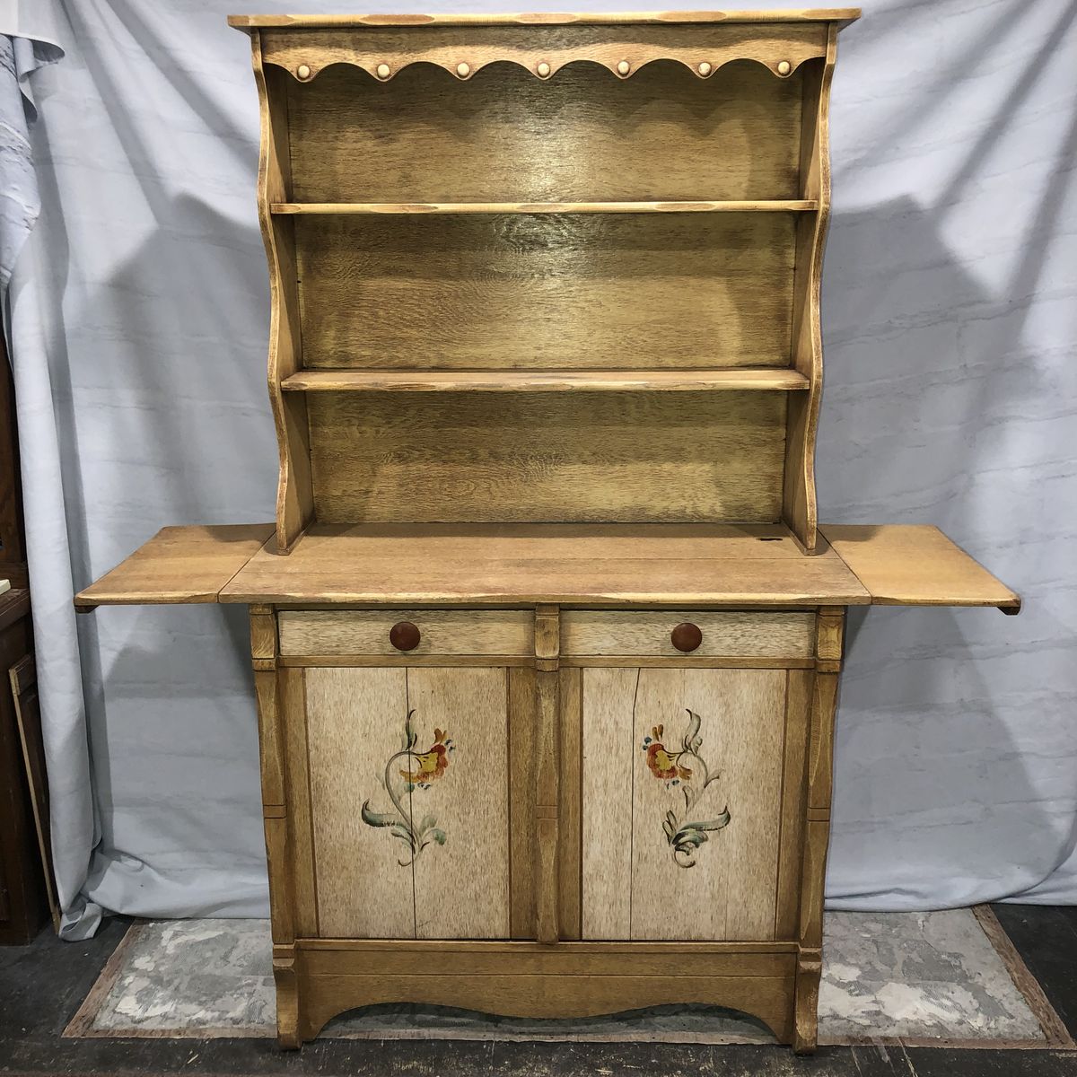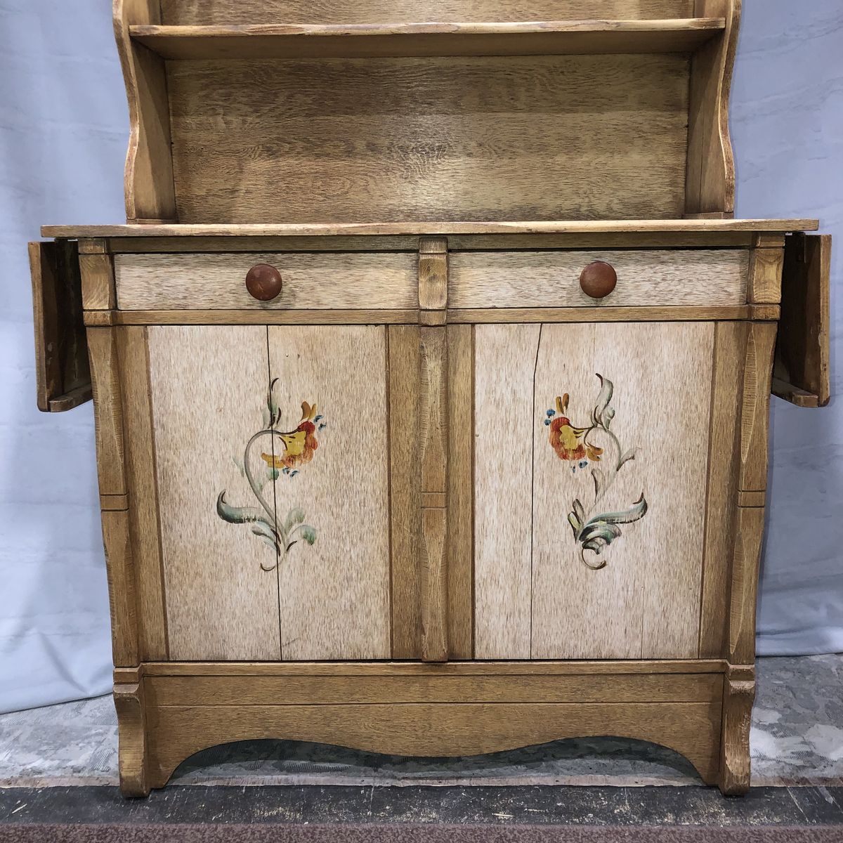 Solid Wood China Cabinet has a distressed amber yellow finish with a Pennsylvania Dutch type floral accent. This can add architectural detail to a plain room creating a Center piece display space for dishes, books, pottery, ceramics, dolls, figurines, model ships, wood carvings, or any collectible that you’d like to display. This is a high quality Cottage or country style cupboard providing decorative shelves and storage space. This unique china-cabinet will add character to any kitchen, living room, family room or bedroom in the house. Measurements: Entire Hutch: 72” tall X 18.5” deep X 42”wide. (With side “wings” attached but folded down) Width with Side wings removed is 40.5”. Wings add 10” on each side when extended.