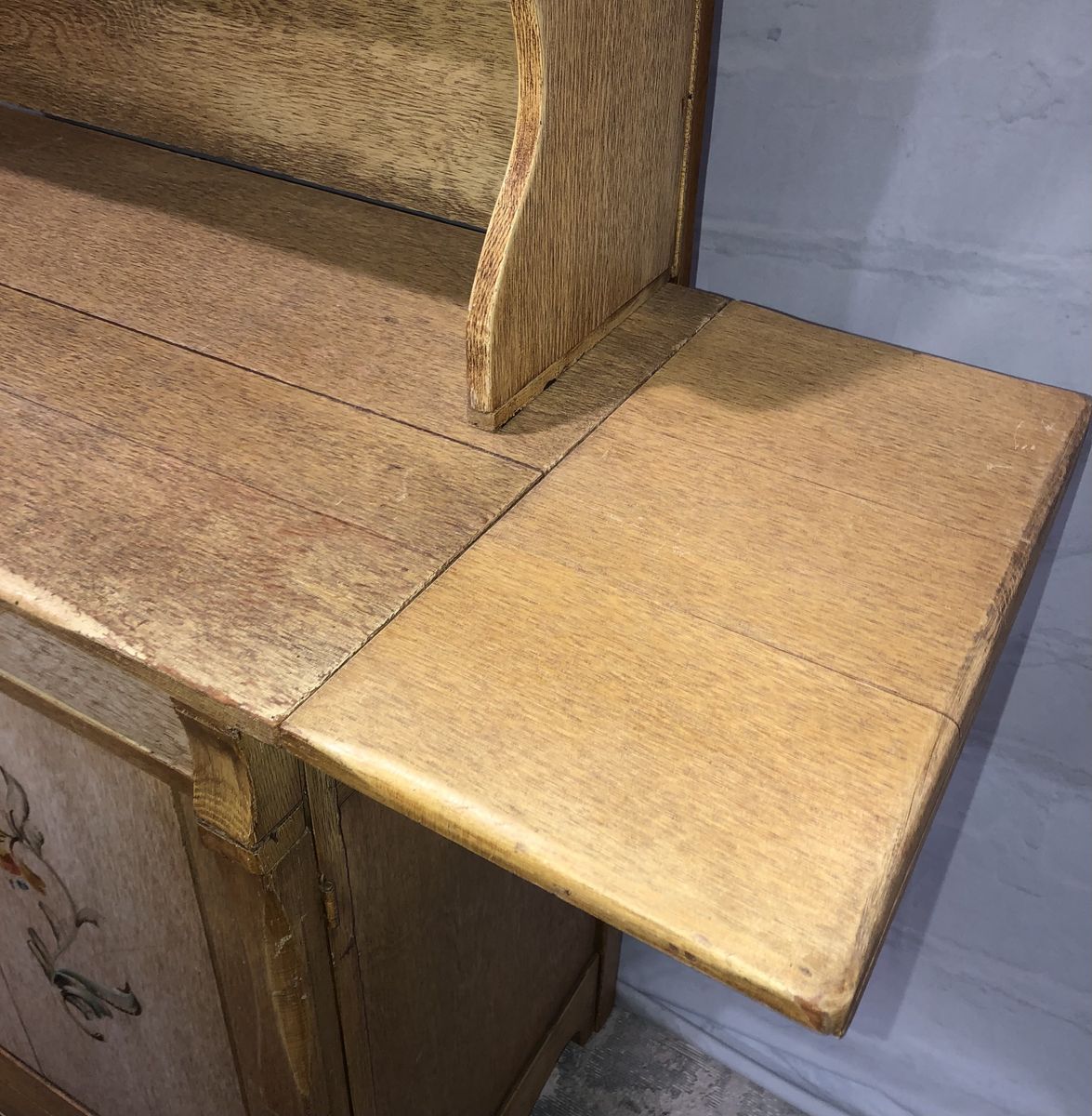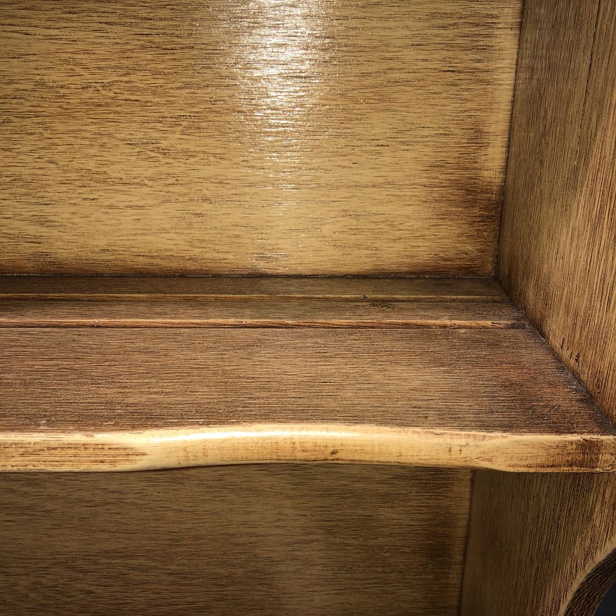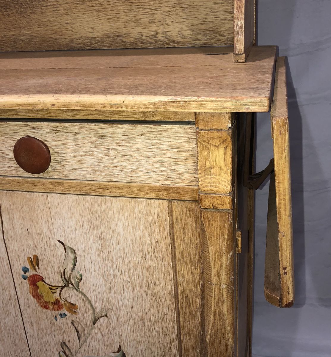 Solid Wood China Cabinet has a distressed amber yellow finish with a Pennsylvania Dutch type floral accent. This can add architectural detail to a plain room creating a Center piece display space for dishes, books, pottery, ceramics, dolls, figurines, model ships, wood carvings, or any collectible that you’d like to display. This is a high quality Cottage or country style cupboard providing decorative shelves and storage space. This unique china-cabinet will add character to any kitchen, living room, family room or bedroom in the house. Measurements: Entire Hutch: 72” tall X 18.5” deep X 42”wide. (With side “wings” attached but folded down) Width with Side wings removed is 40.5”. Wings add 10” on each side when extended.