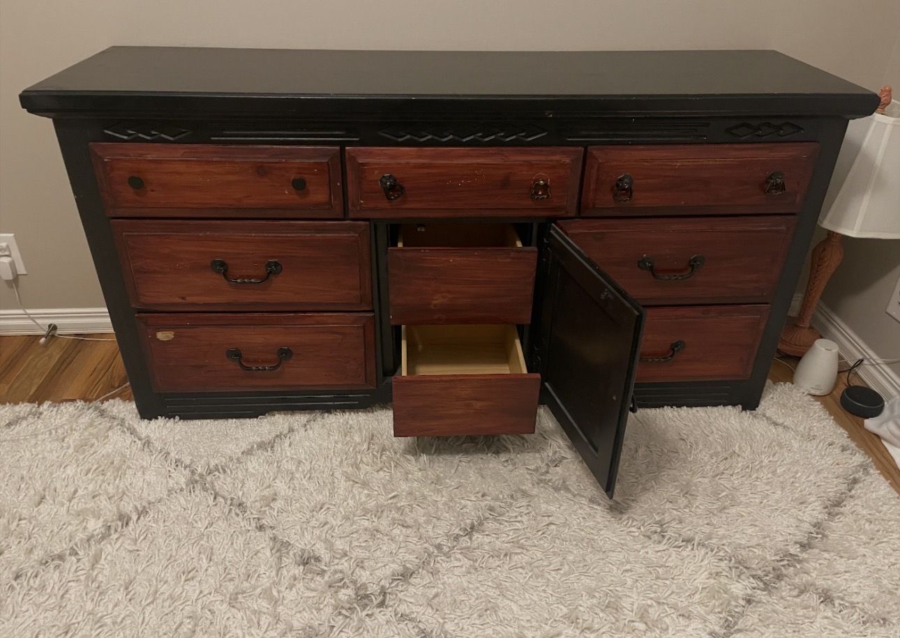 VenmoSolid wood dresser. It’s showing signs of wear, but it’s still in pretty good condition. It measures 64” long, 18” wide, 32” tall.