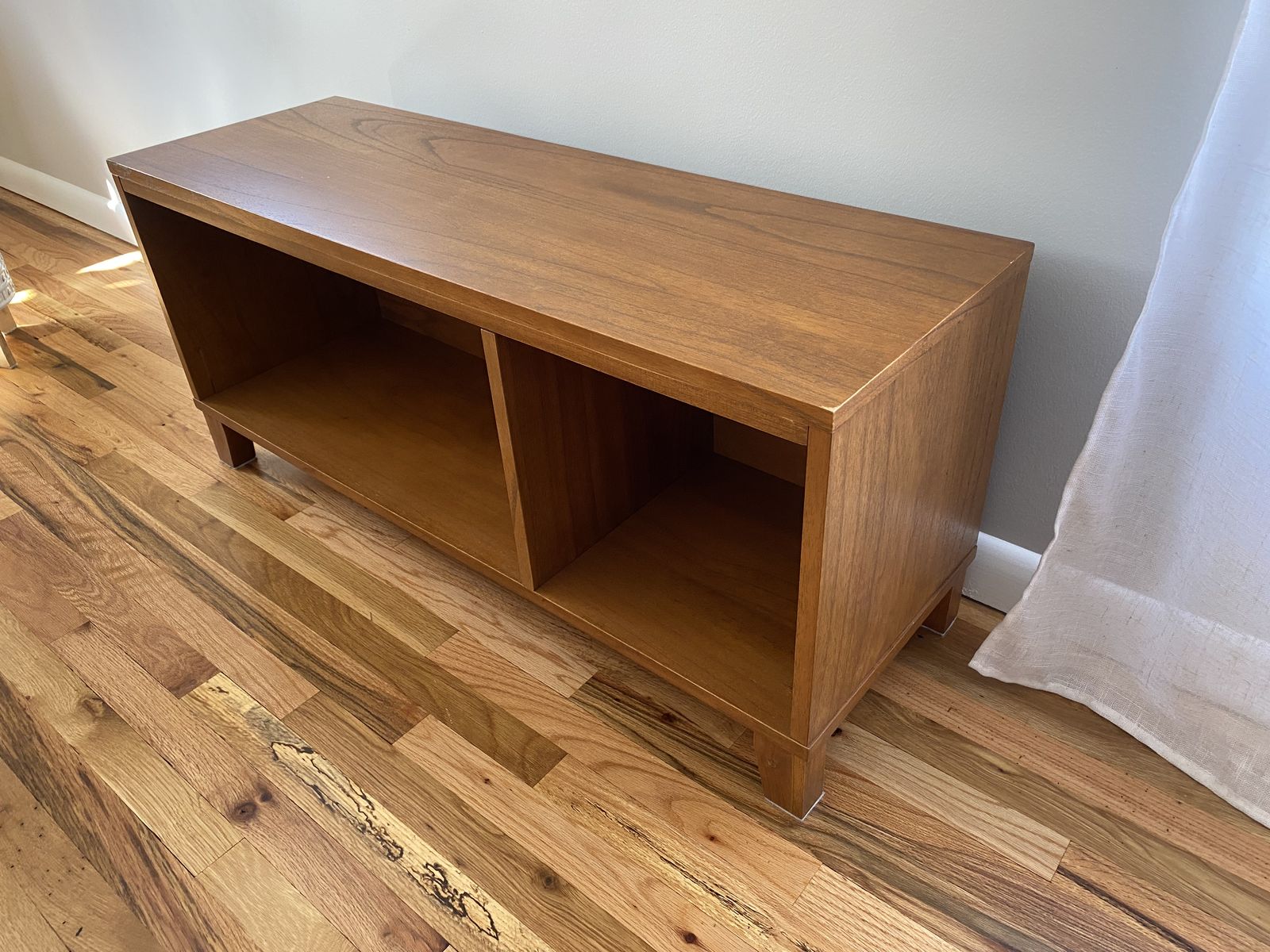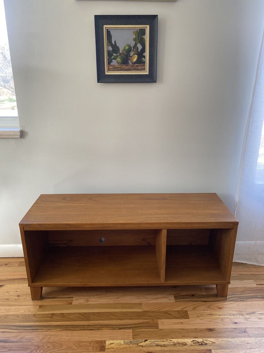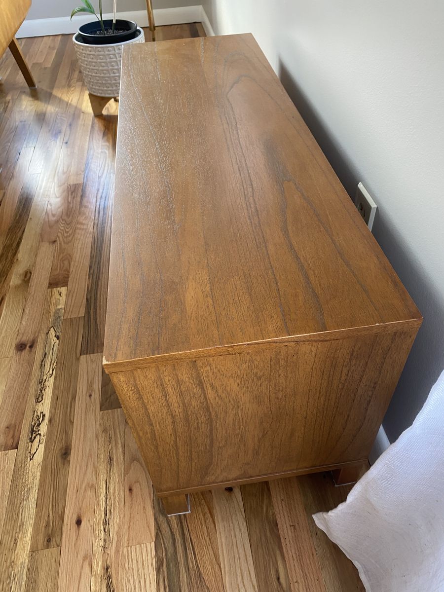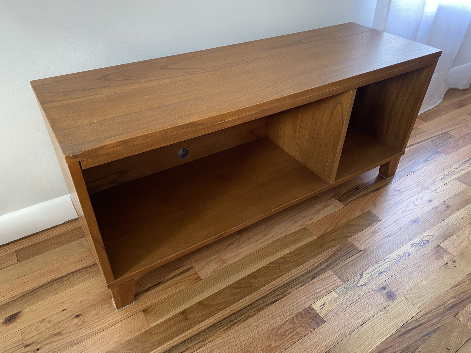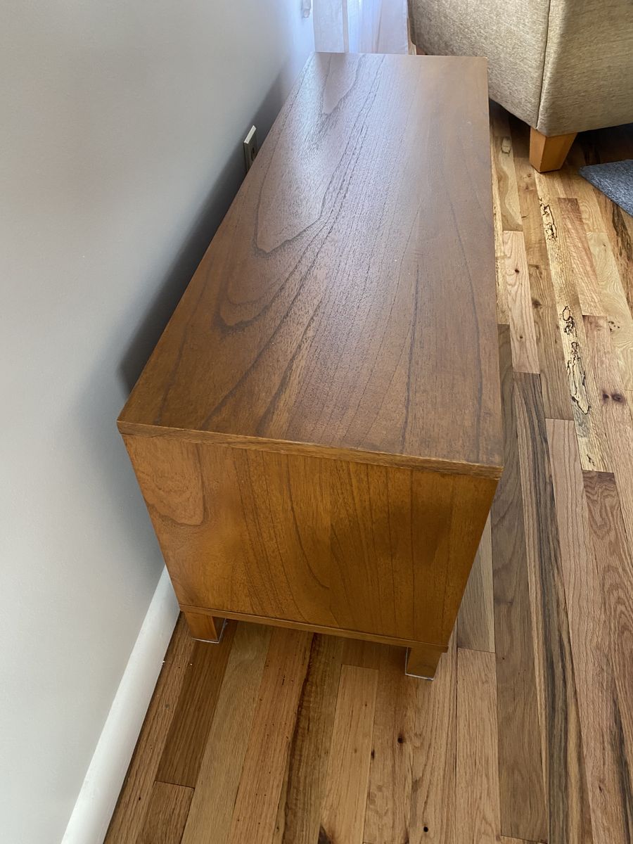 minor wear on one corner (see pictures). we used it as a TV stand and drilled a cord access in the back of cabinet to connect devices.