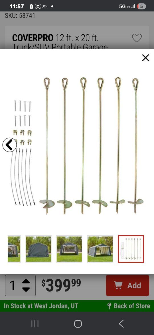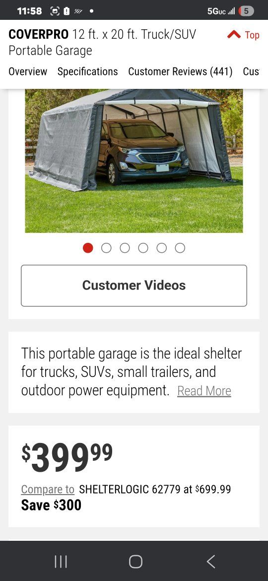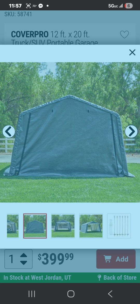 CashApphello im selling my portable garage I bought last year and then had to move so I never got the set it up it's still in the box un opened! it's a 12'x 20' and cost me $450 dollars after tax. im willing to let it go for $220 obo. please let me know if you have any questions or would like to come get it thank you have a nice day.