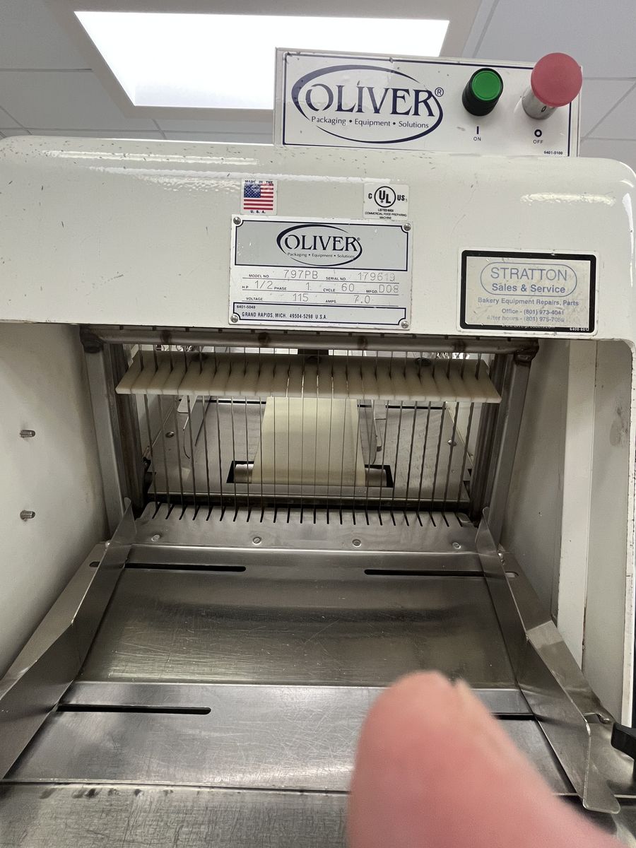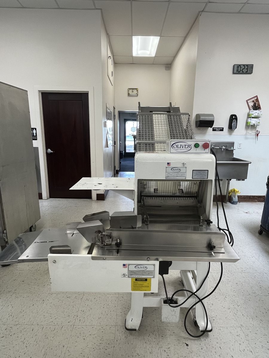 VenmoCommercial Oliver 797PB bread slicer. Great for bakery or restaurant. Slices hundreds of loaves or bread efficiently. Stainless steel parts. Upgraded cage-guard. Can hold 10-12 loaves. Foot pedal option.