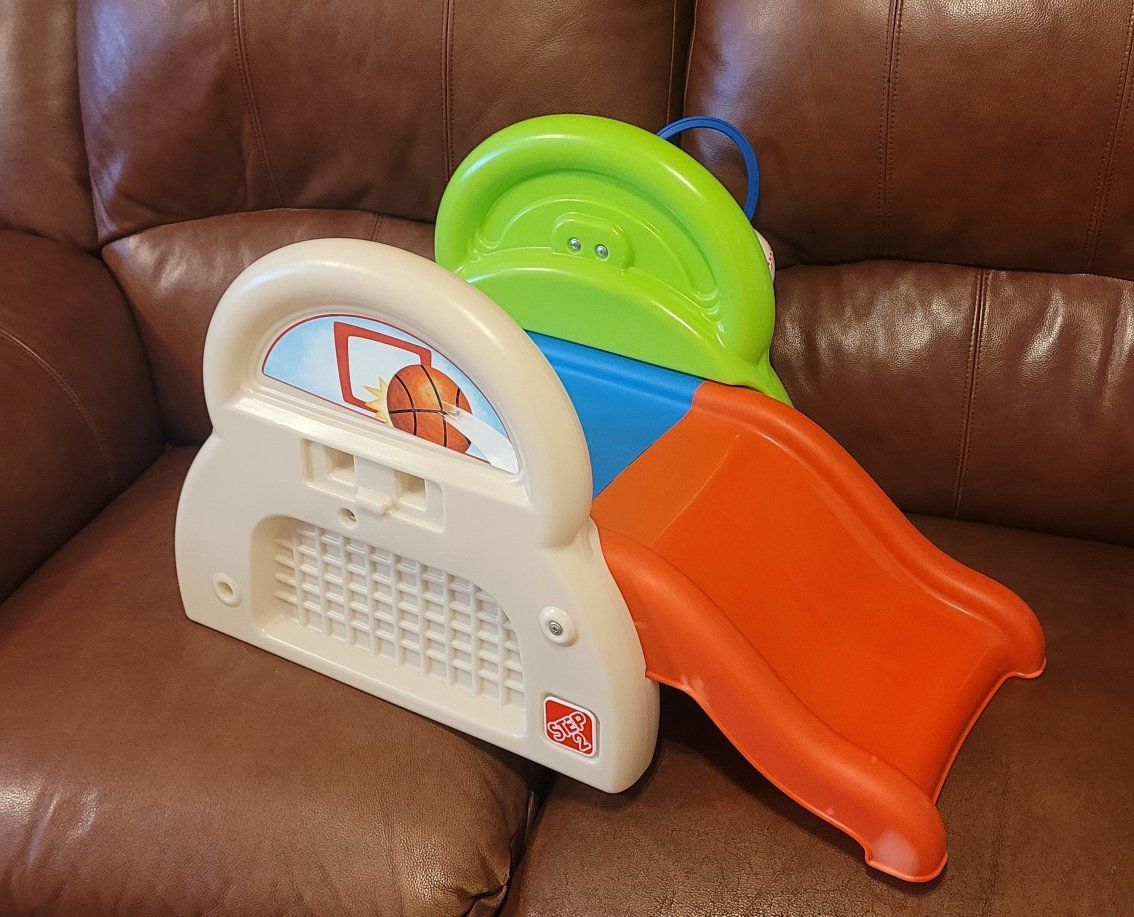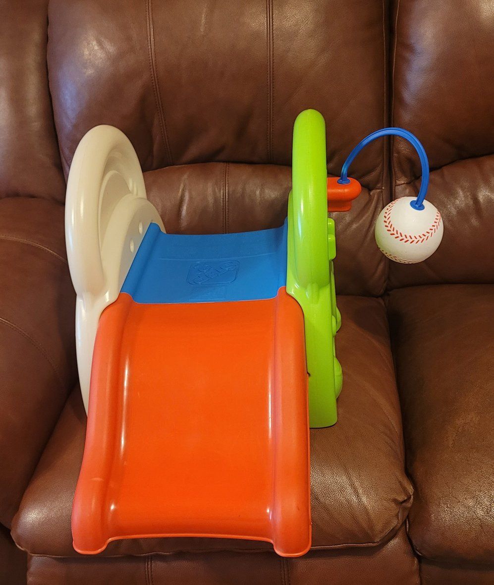VenmoToddler sports center with steps and mini slide. Designed for toddlers ages 12 months and older, with a maximum weight capacity of 45 lbs. Missing basket ball hoop, bat and basketball.