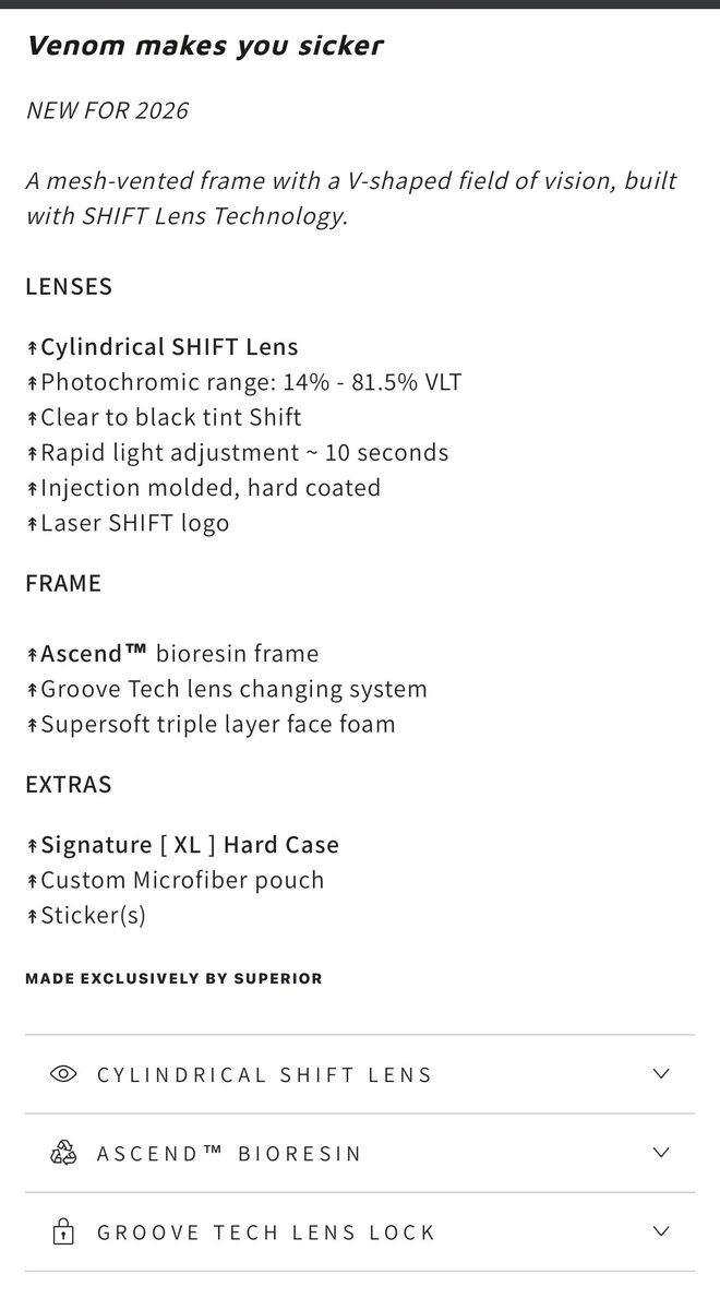 Cylindrical SHIFT Lens Photochromic range: 14% - 81.5% VLT Clear to black tint Shift Rapid light adjustment ~ 10 seconds Injection molded, hard coated Laser SHIFT logo