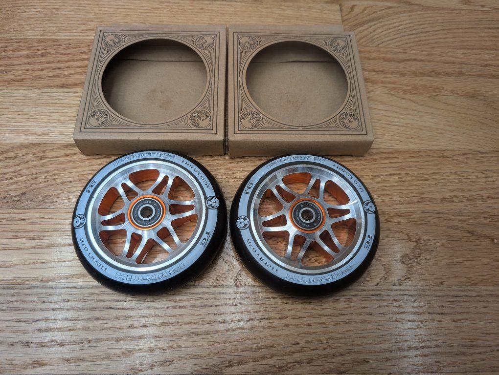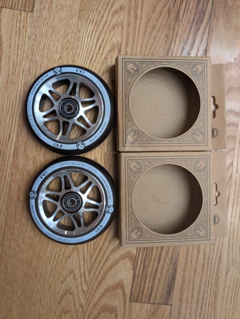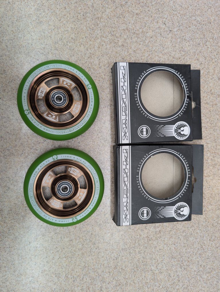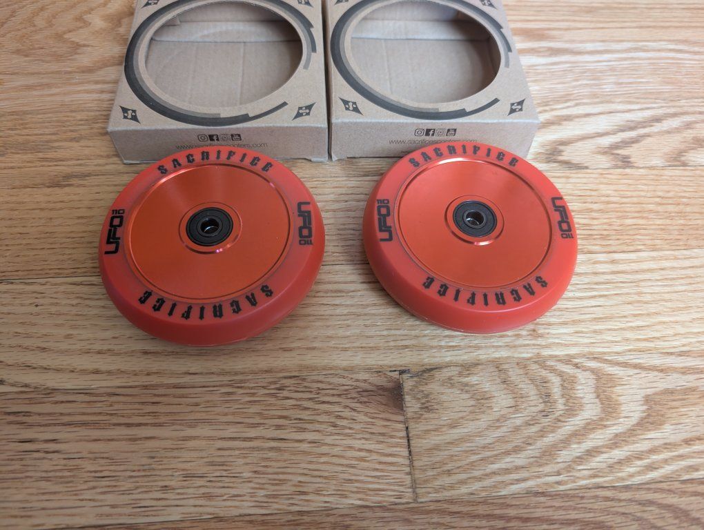 Pick any pair of Pro Scooter wheels for the listed price. All wheels in the photos are 110mm x 24mm. I also have 120mm and 125mm wheels. Check out my other listings. I have a TON of pro scooter parts. Many not listed on KSL, so hit me up to come check them out.