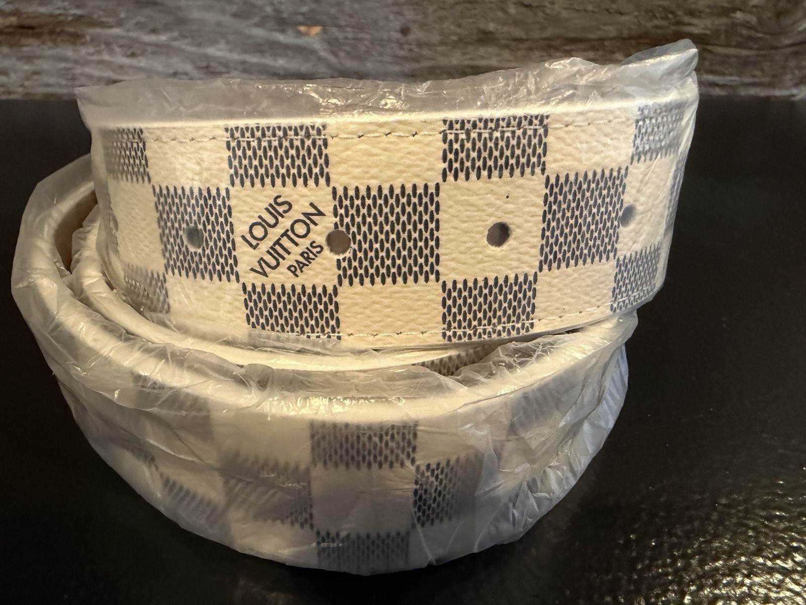 ApplePayClassic Damier Azur white checkerboard pattern with gold LV buckle.