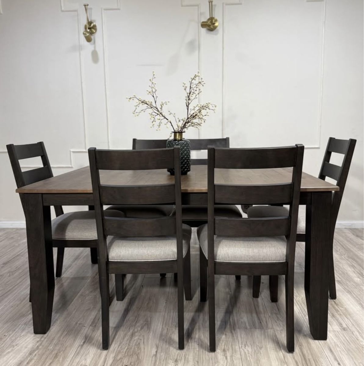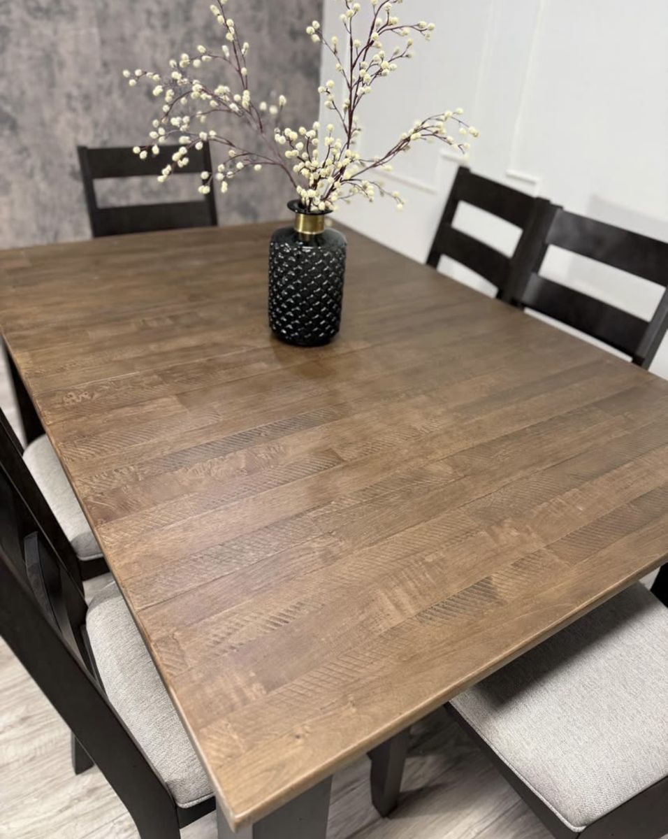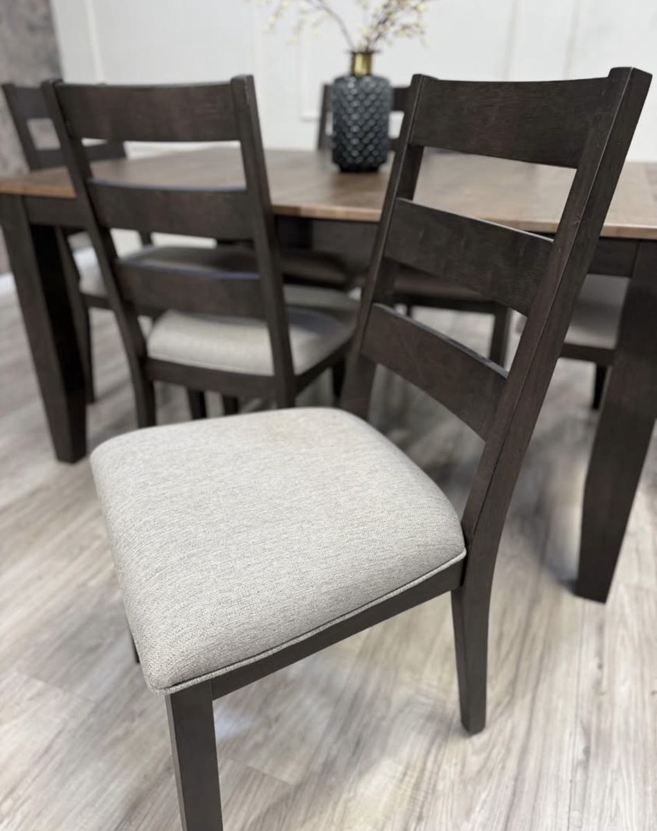 The Midtown Dining Set is a simple yet timeless quality dining collection with ladder-back wood and upholstered side chairs. The solid natural Ambrosia Maple and hardwood construction emanate an organic style and appeal. The two-toned finish of Black and Brown enhances the look of this transitional dining set.