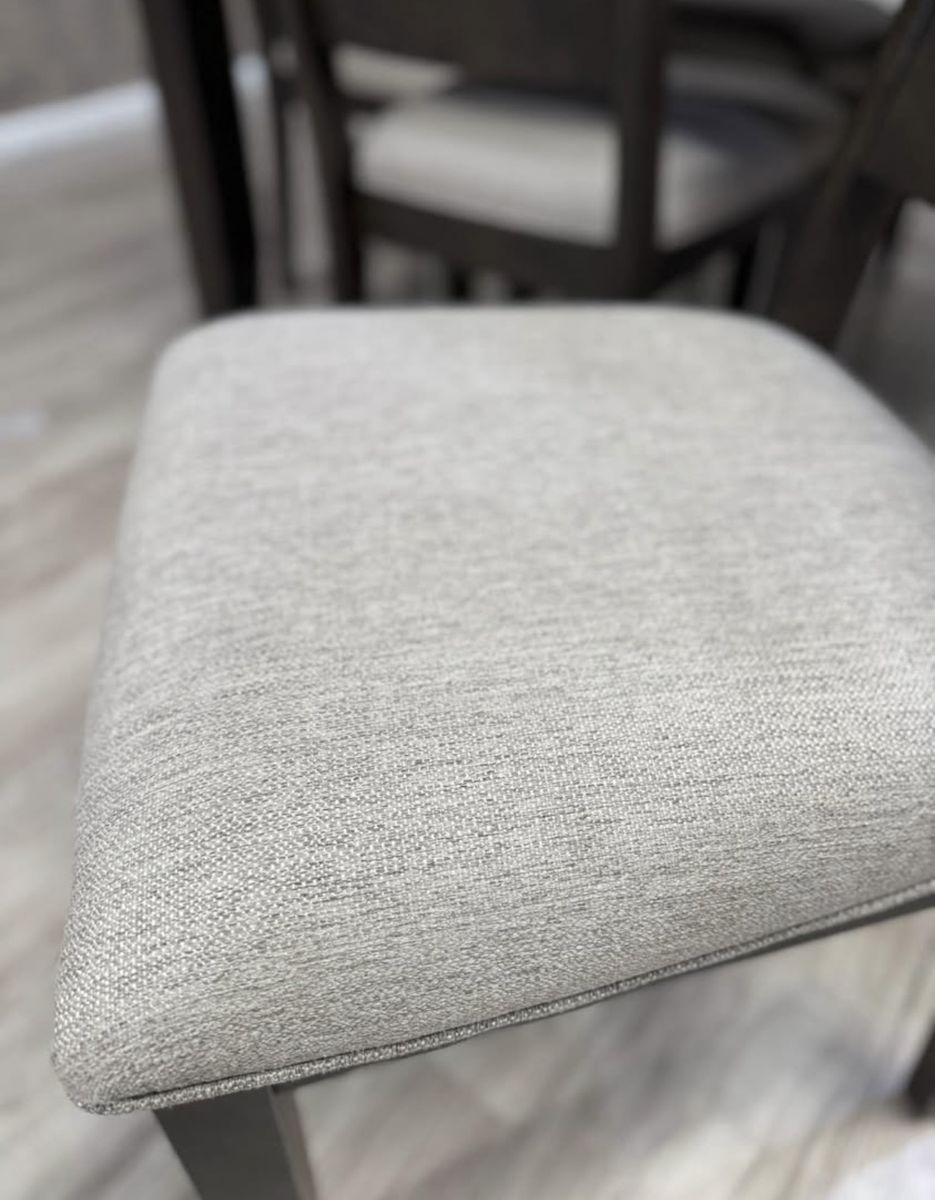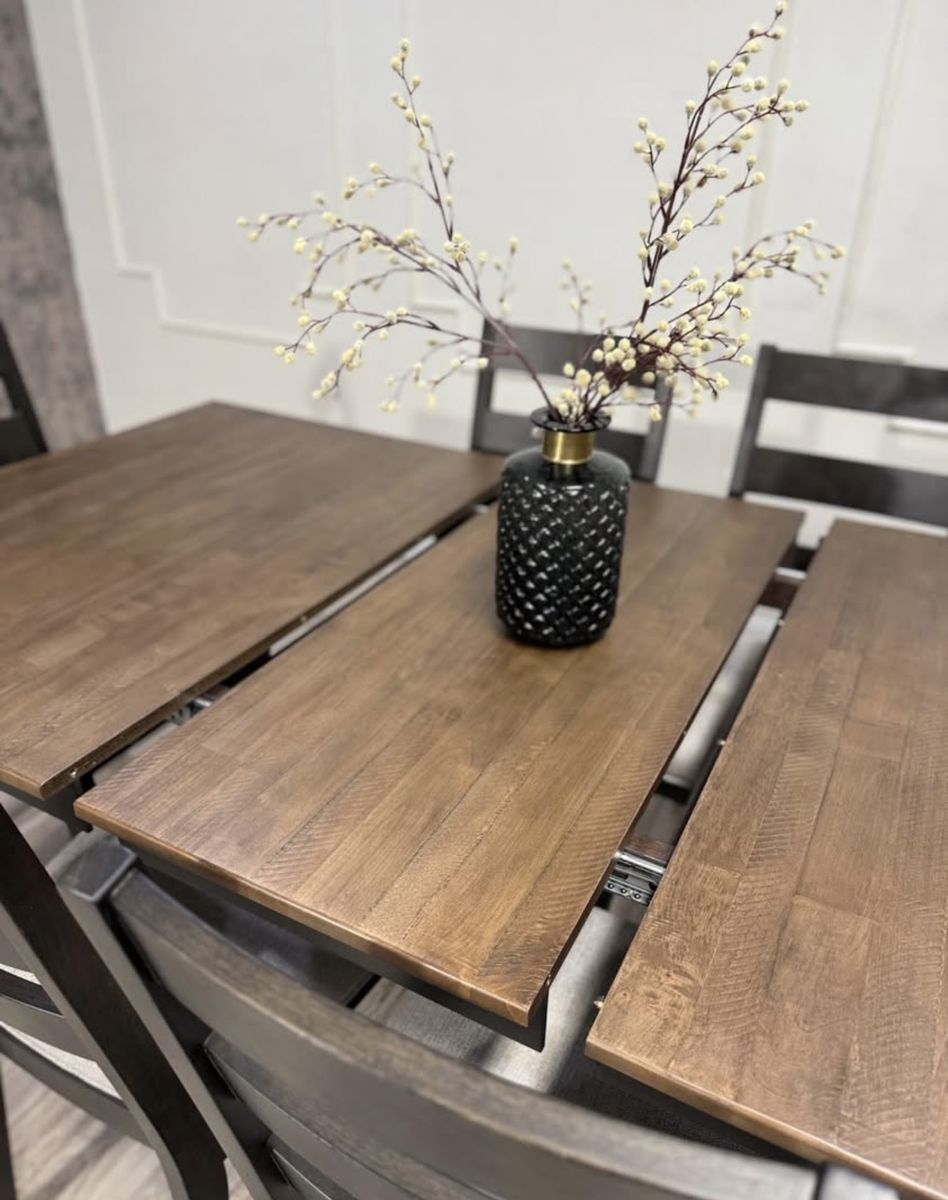 Two-tone Black and Brown finish Constructed of Ambrosia Maple and Rubberwood solids Ladder-back stools upholstered in a light Gray polyester blend Includes 18 Self-Storing Leaf Rough sawn top and rubbed Black base Metal glide mechanism for extended top Imported