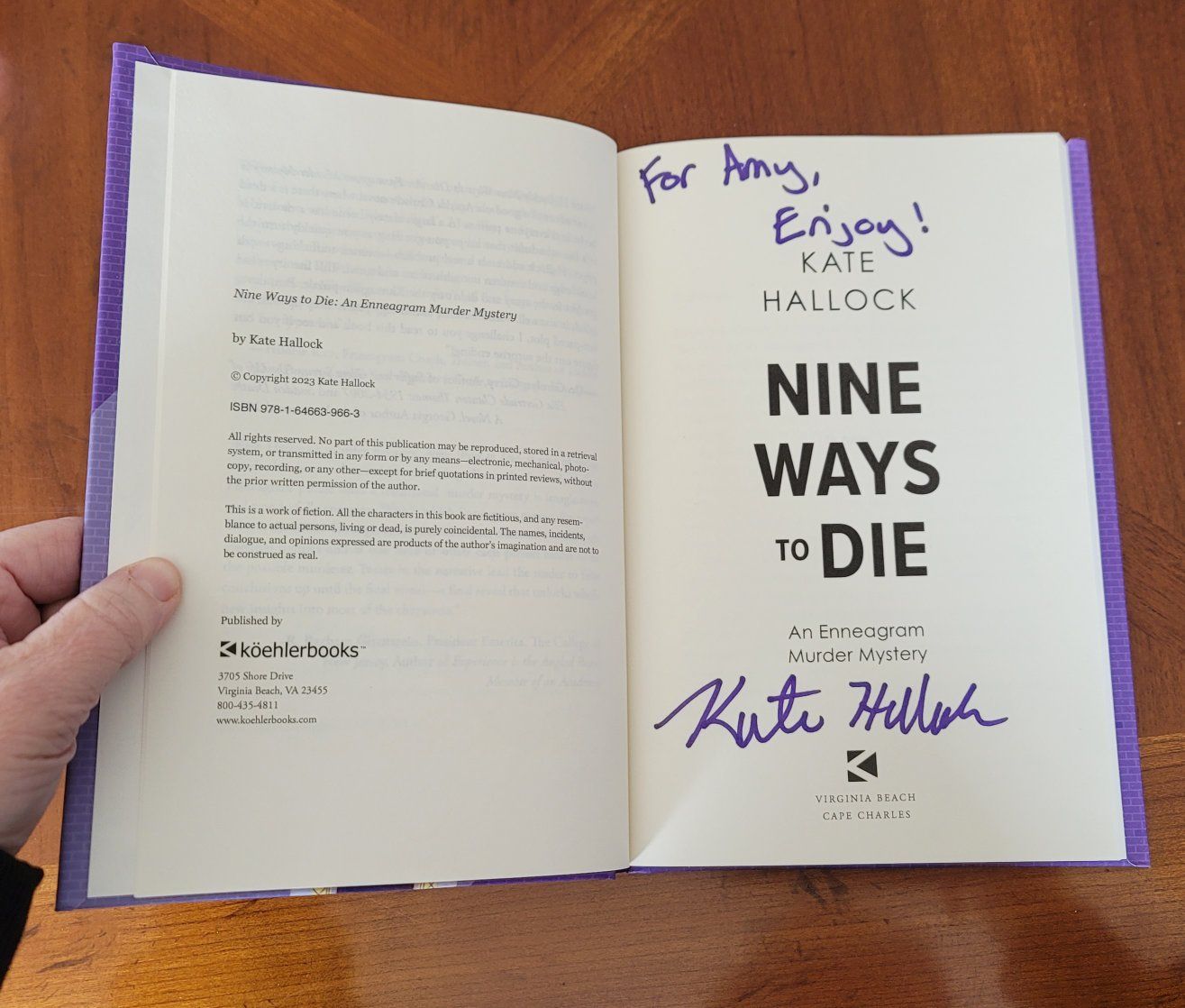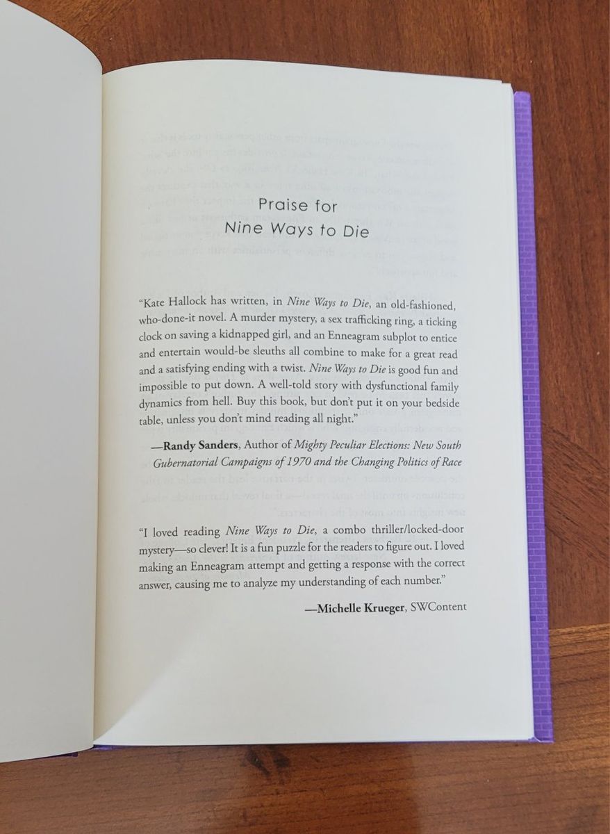 PayPalI am selling a new, never read, hardcover book called "Nine Ways to Die". This is a fun, thrilling, murder mystery based where each character represents a different number on the enneagram. I purchased this book directly from the author, Kate Hollock, in the 2024 Nashville Book Festival. She signed it, which also has my first name in it where she addressed it to me.