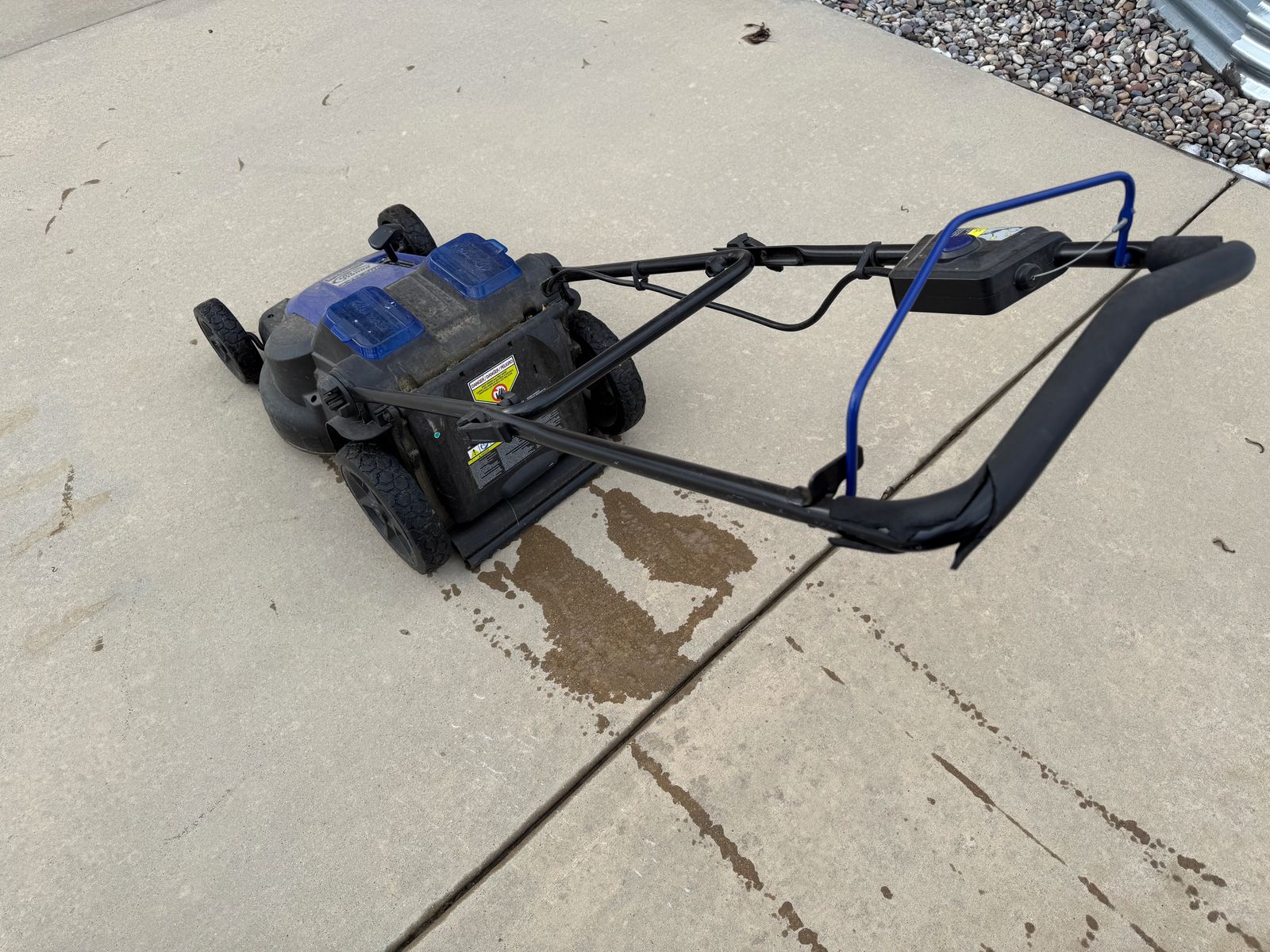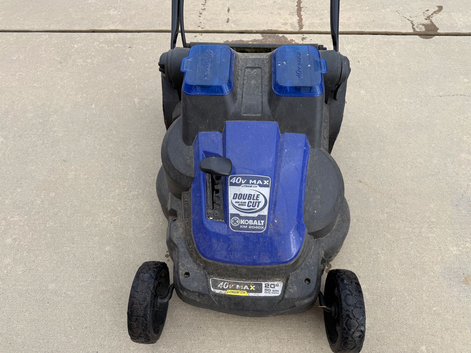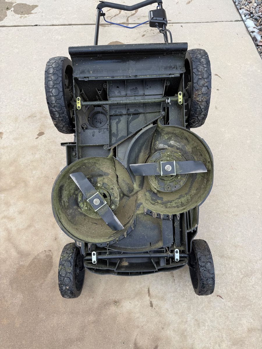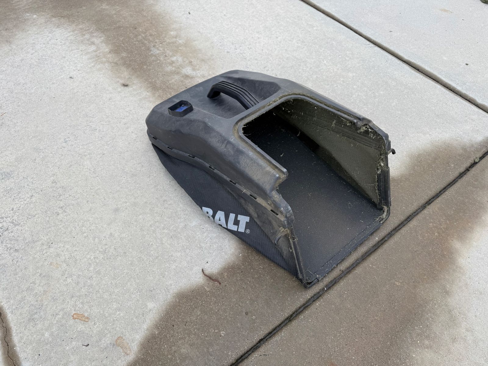 ApplePayAdjustable height, includes bag and mulch block. Handle grips worn and tearing. Battery and charger listed separately.