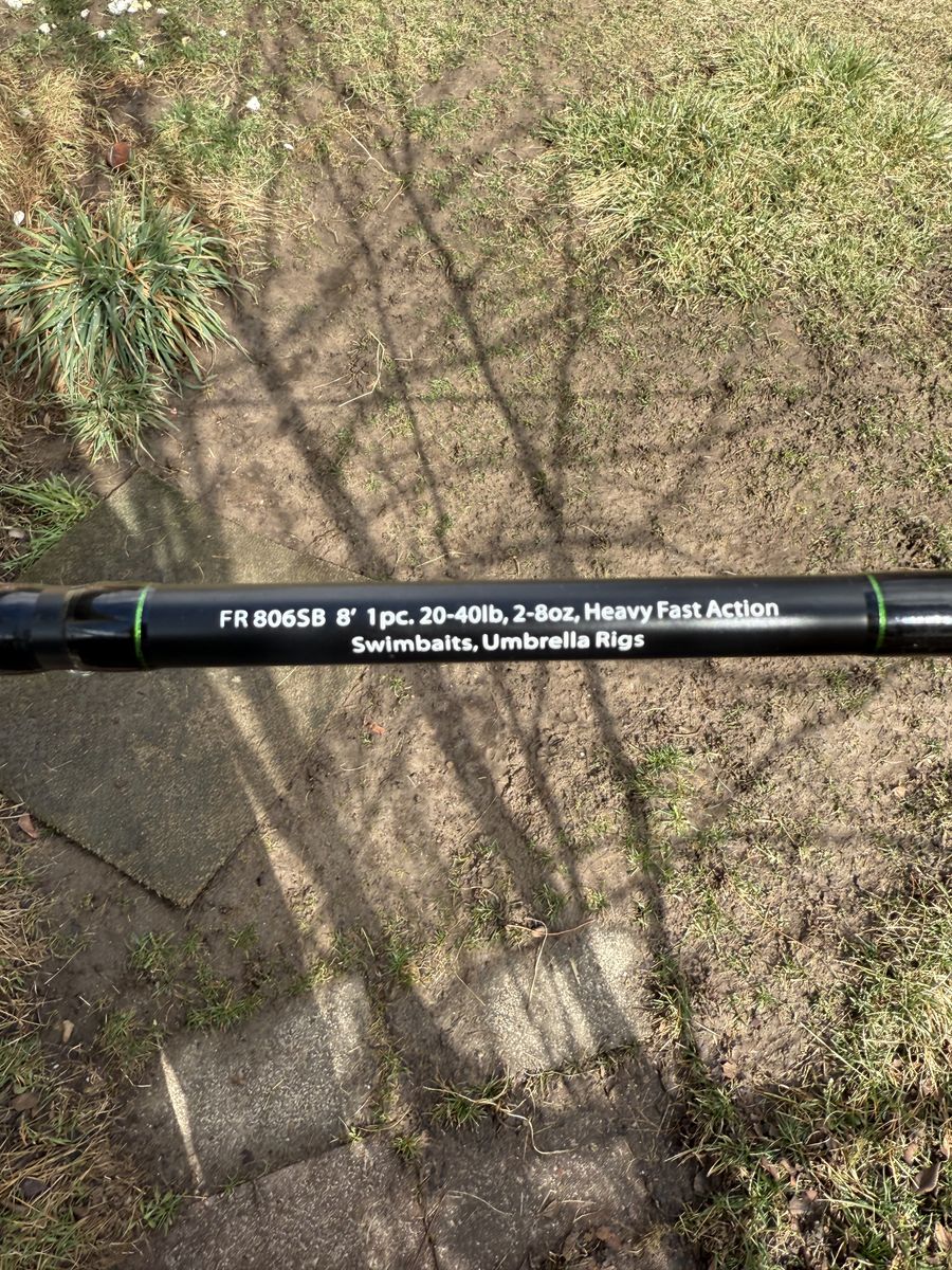 8’ Dobyns swimbait rod. Rated 2-8oz. Good conditioner barely used it. Does not come with the reel.