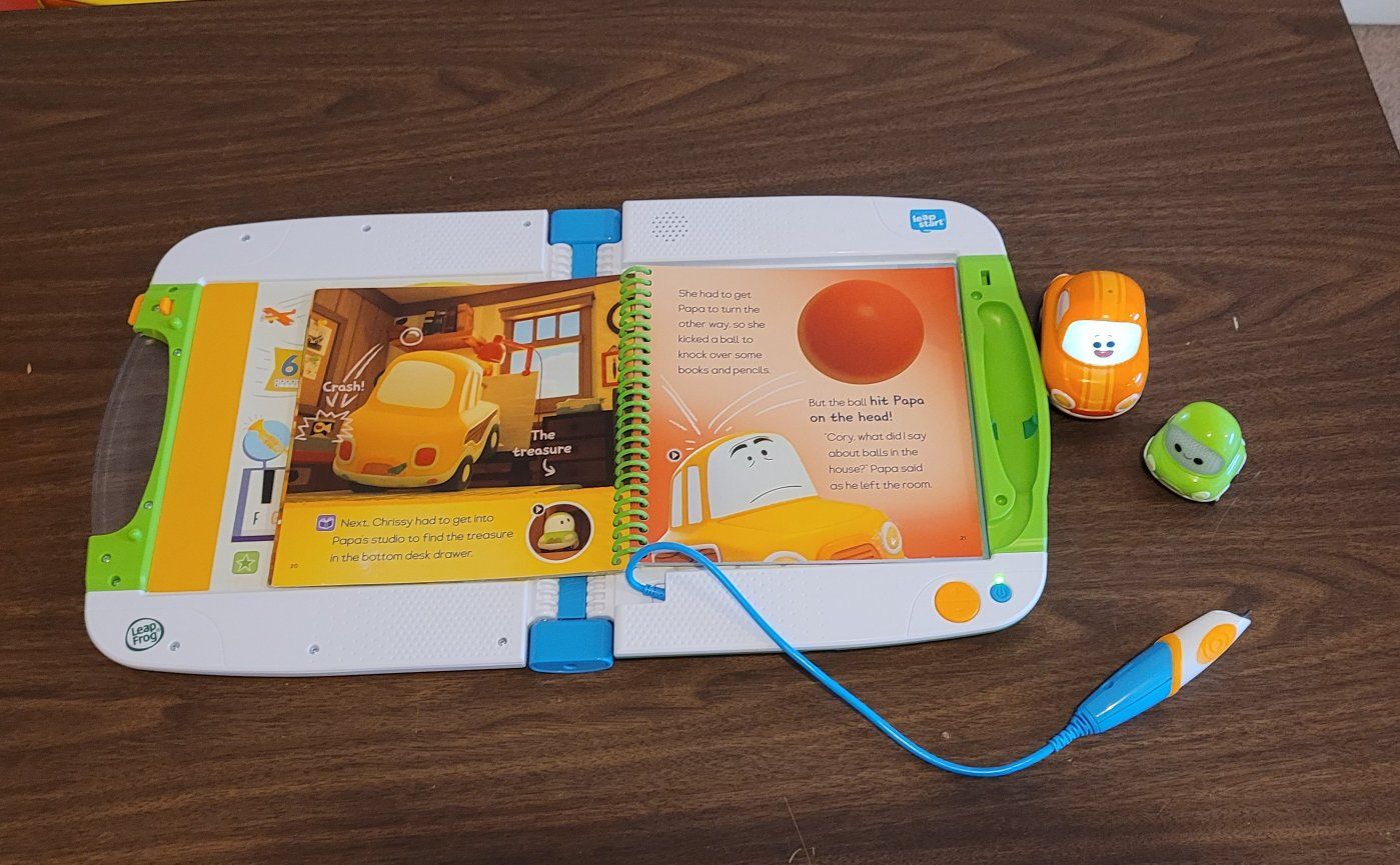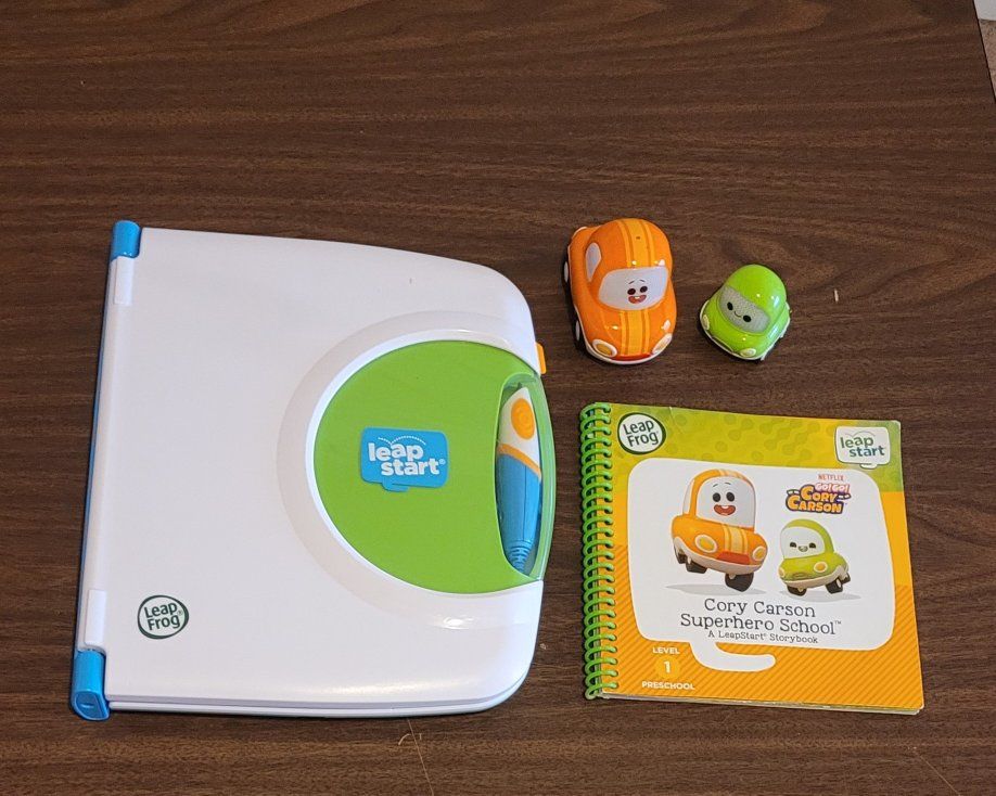VenmoLeapStart Interactive System book and stylus, takes 2AA batteries, included. "Cory Carson Superhero School" A Level 1 Preschool activity focusing on reading comprehension, problem-solving, and social-emotional skills. Two small figurines of Cory and Chrissy Carson are included, Cory lights up and talks.