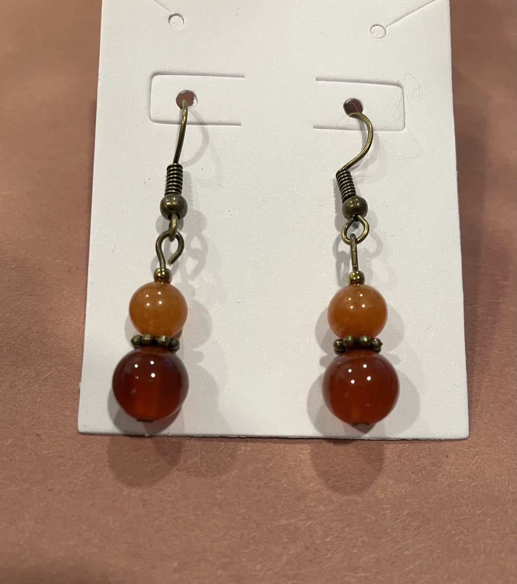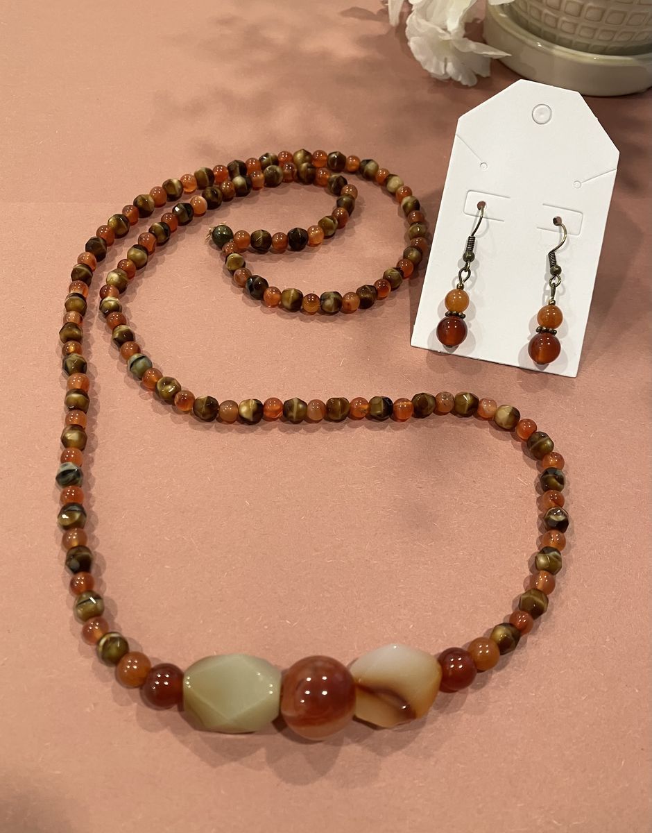 VenmoBeautifulcarnelian and tiger eye gemstone, 30 inch long beaded necklace and matching earrings with brass ear wires. No clasp to worry about for easy, comfortable wear. Gift box included. Local meetup or can mail with ship fee.