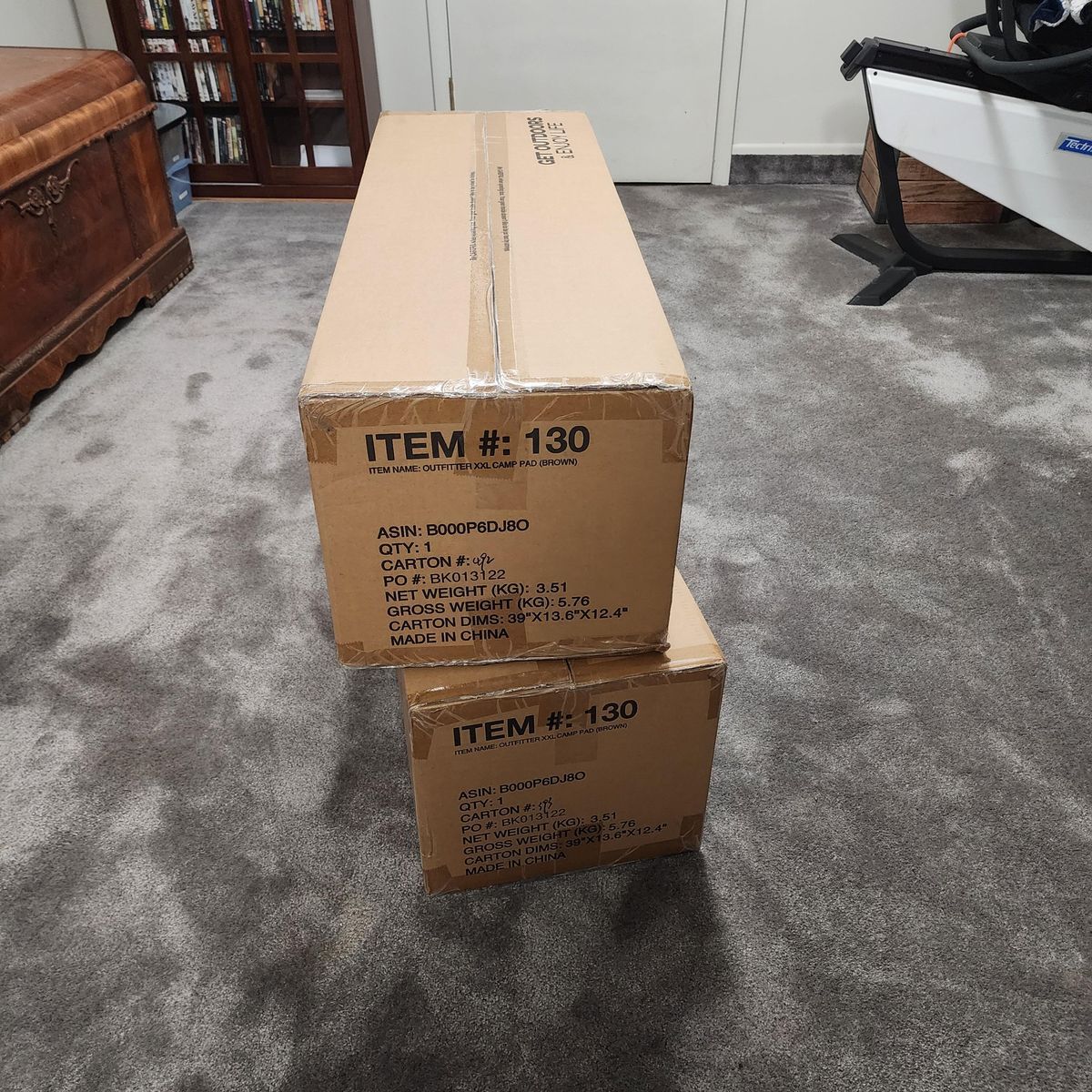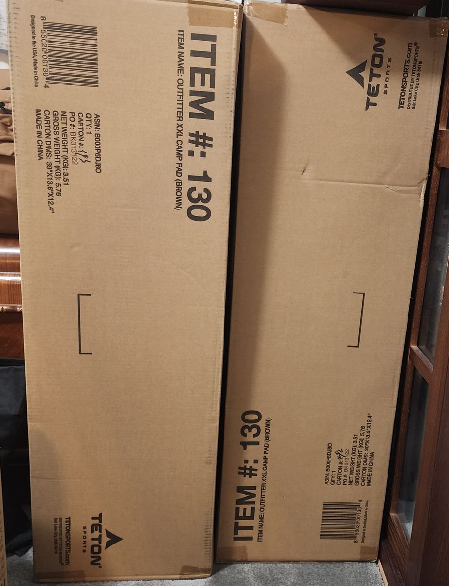 $99 each or $198 for both Outfitter XXL Camp Pads - new in boxes Size: 82"L x 38"W x 2.5"H Boosts your sleeping comfort on the ground or a cot. ALSO SELLING SEPARATELY 2 COLEMAN ELK HUNTER EXPONENT XXL SLEEPING BAGS FOR $75 EACH AND 2 XXL COTS FOR $130 EACH. PLEASE SEE OUR OTHER LISTINGS FOR DETAILS.