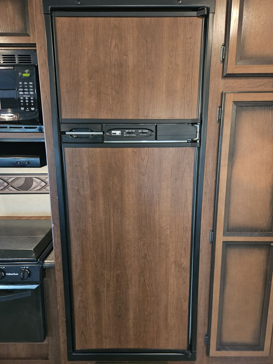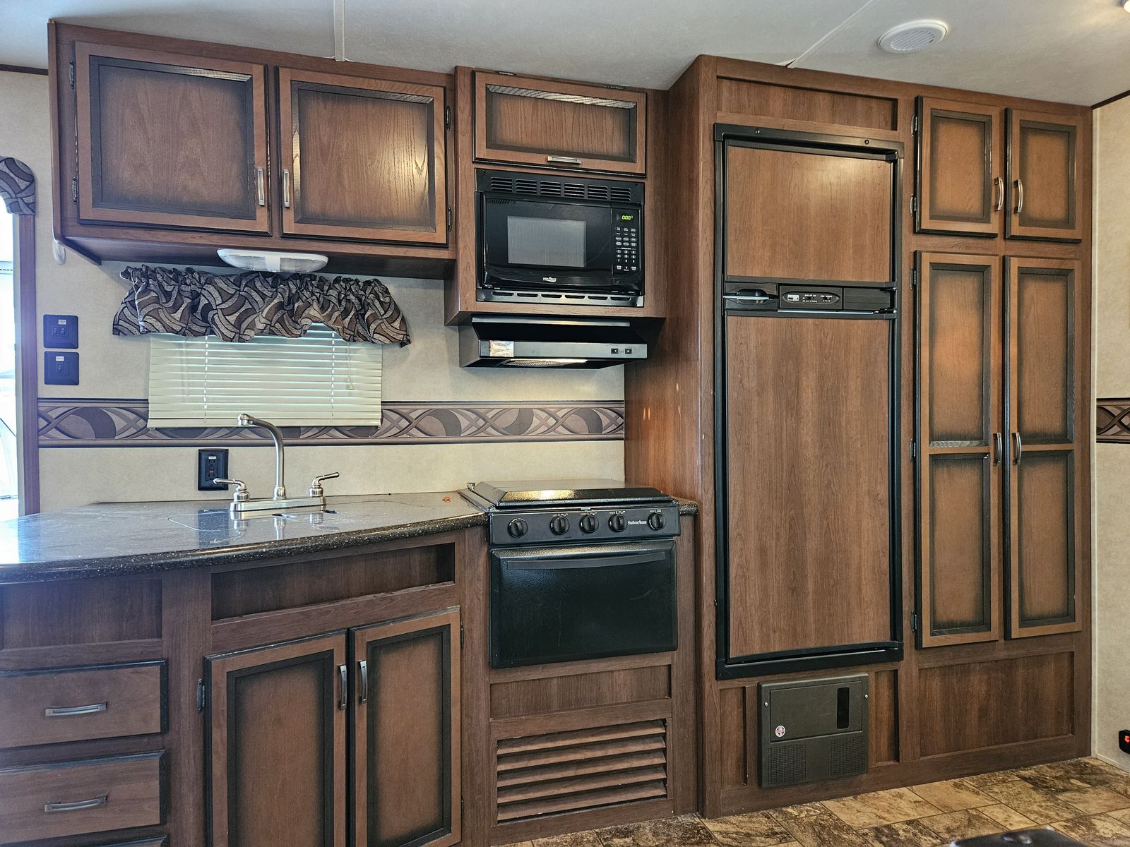 Comfy Kitchen with Full Size Gas/Elec Fridge, Microwave, 3 Burner Cook Top with Range, Oven, and Double Sink with Matching Countertop Covers!