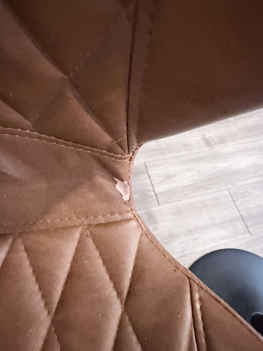 VenmoBrown faux leather with black bases. Hydraulic bases to adjust height. In good shape. One barstool has a small peeling in the corner —- see photo