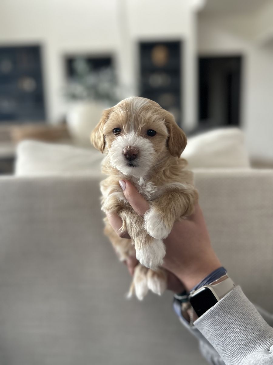 Mom is a chocolate parti Havanese and dad is a mini red poodle both 11lbs, she should be 10-12lbs full grown. Both Havanese and Poodle breeds are hypoallergenic and very low shed. Our puppies are raised in our home with multiple children of all ages, their mom, and our other dog. They are VERY well socialized and handled a lot. All of them are playful and cuddly, they make the best family dogs especially for smaller children!! They will be ready for their forever homes the week of March 22nd at 8 weeks old. They will come with a vet check and their first vaccinations and dewormer complete