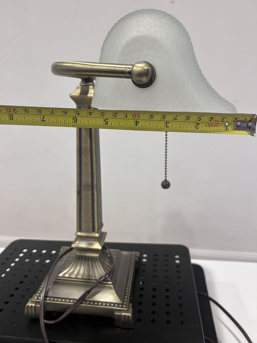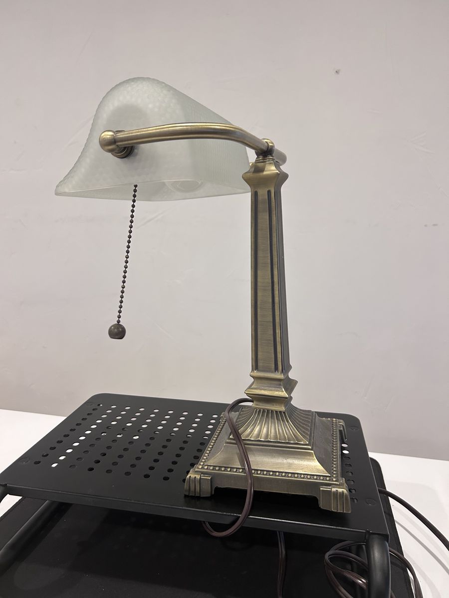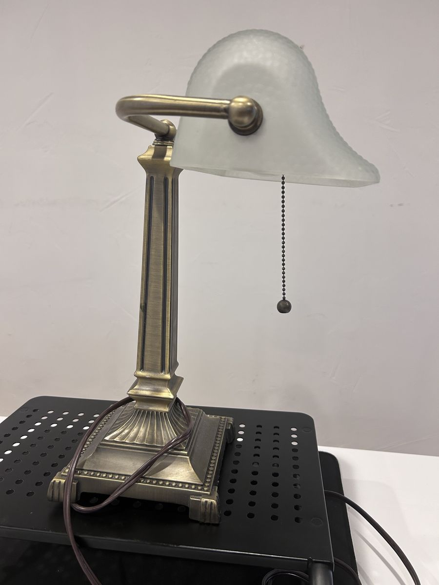 ZelleThe Mid-Century Modern Desk Lamp is a large, corded electric lamp with a vintage design from the 1950s. Made of brass, glass, and metal, this desk lamp features a shaded, bell-shaped lamp shade in a metallic finish. With a pull chain control style and incandescent lighting technology, this desk lamp is perfect for unisex adults looking to add a touch of art and style to their workspace. The lamp's multicolor design and solid color pattern make it a unique addition to any modern office setting.