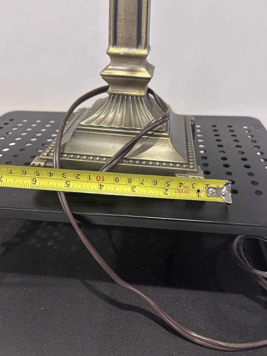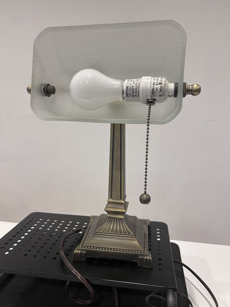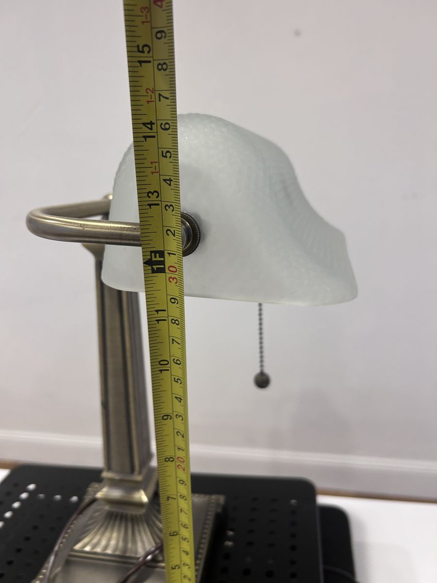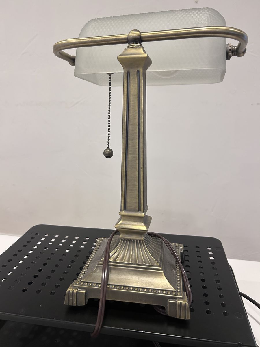ZelleThe Mid-Century Modern Desk Lamp is a large, corded electric lamp with a vintage design from the 1950s. Made of brass, glass, and metal, this desk lamp features a shaded, bell-shaped lamp shade in a metallic finish. With a pull chain control style and incandescent lighting technology, this desk lamp is perfect for unisex adults looking to add a touch of art and style to their workspace. The lamp's multicolor design and solid color pattern make it a unique addition to any modern office setting.