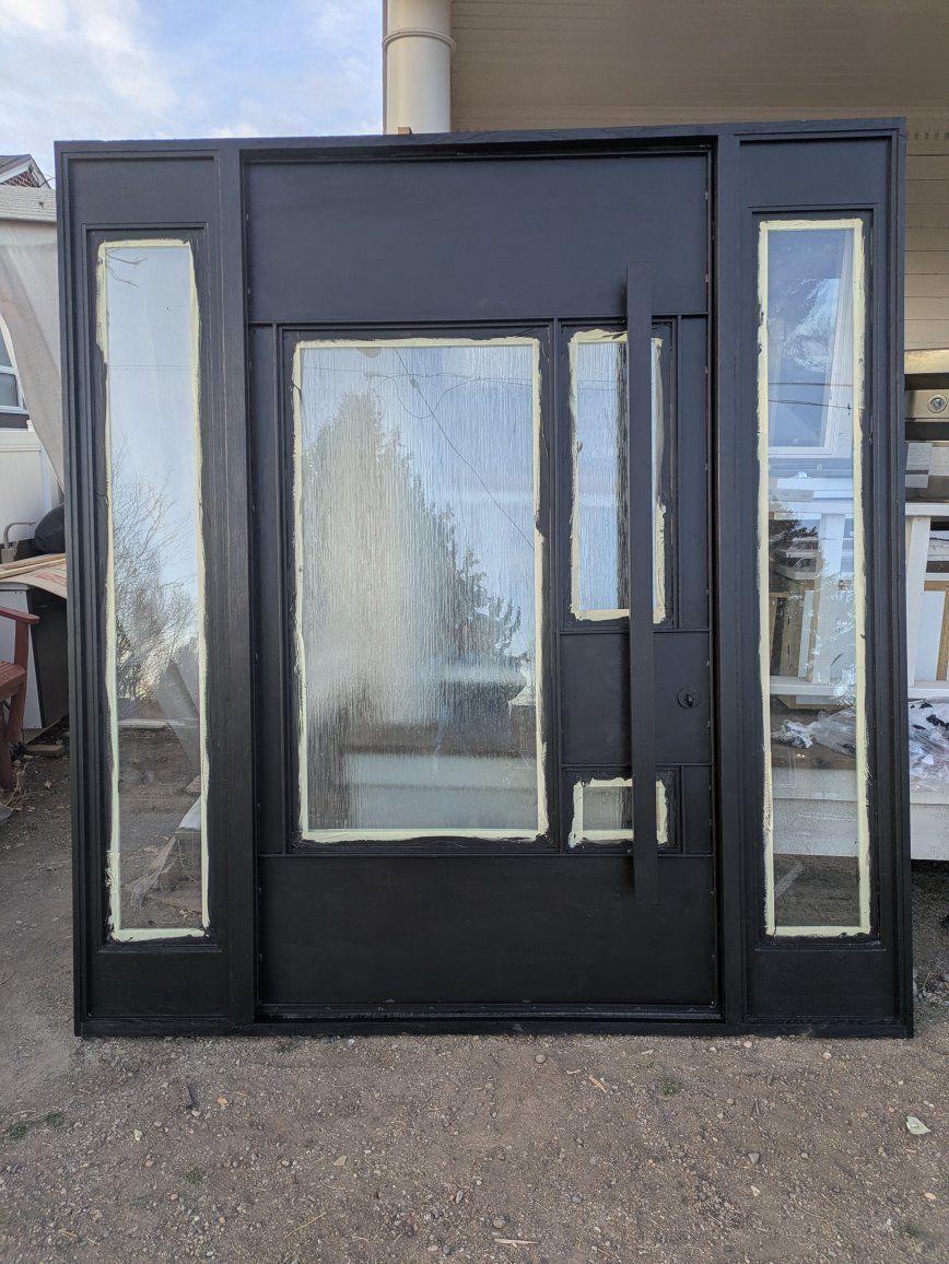 This pivot door is currently painted. I think it could use a custom look by stripping off all of the latex paint on the metal door. The actual frame is Oak painted black semi-gloss.