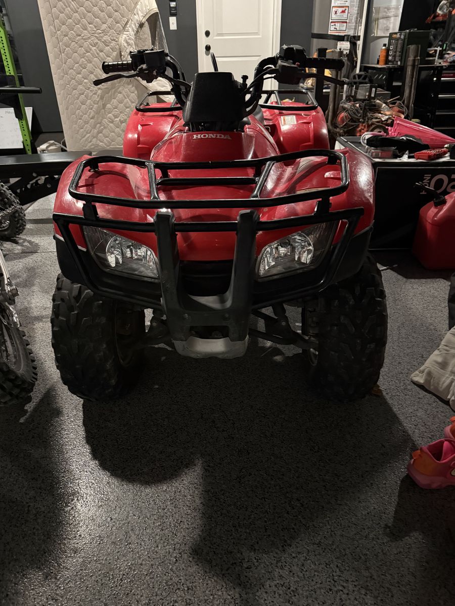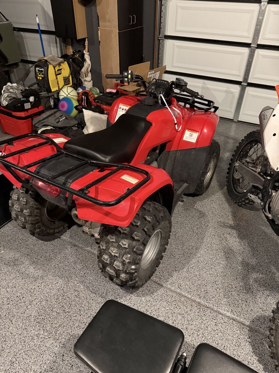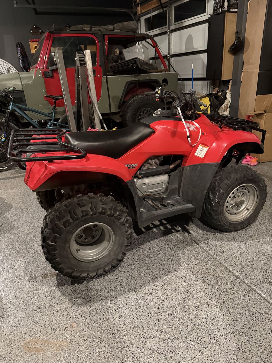 2005 Honda 250 2wd. Low hours, spent almost entire life in the backyard on grass or in the garage. It has not moved for two years, just pull started it and put a new seat on. Front tires are worn, back tires have plenty of tread.
