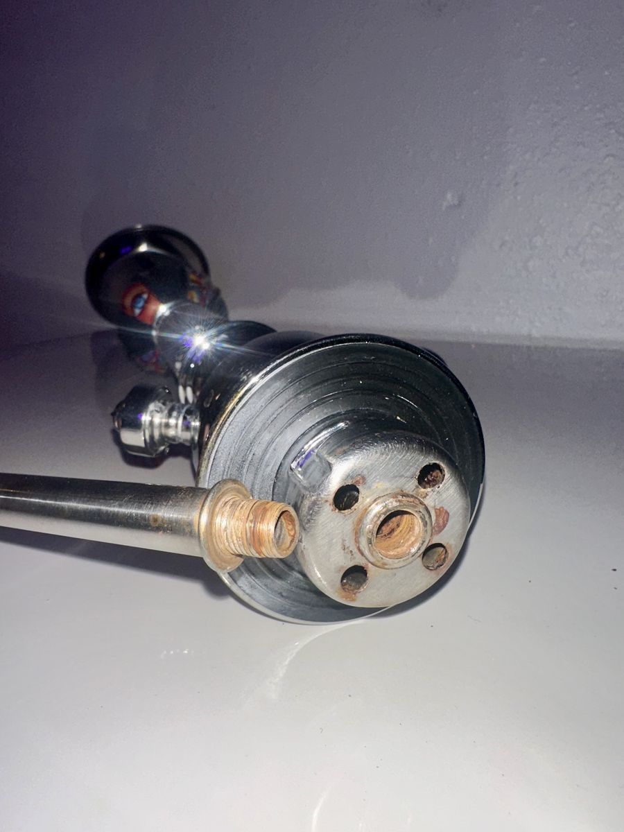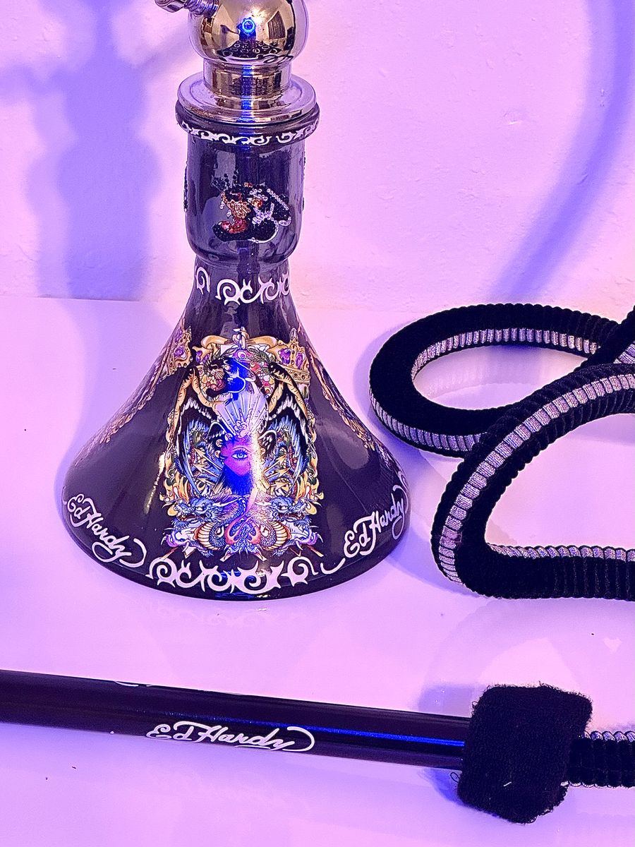 VenmoEd Hardy Tattoo Design Hookah collectible for $40! The mouth piece for the Ed Hardy hose is not connected but there is another hose included. The metal tube for the bottom is rusted so that it doesn’t stay in the bottom part. The last two pictures show both issues.