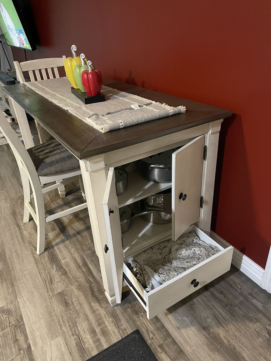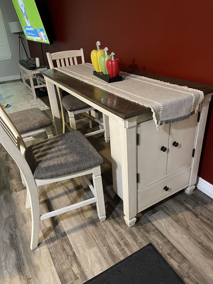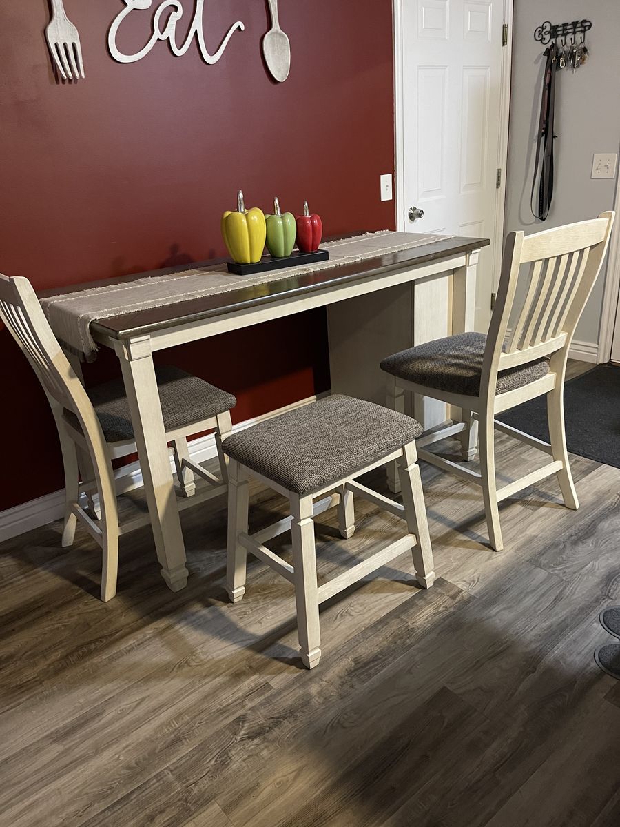 Dining table set with two chairs, one stool and a bench, the table has storage. Color beige. Dimensions 65x30