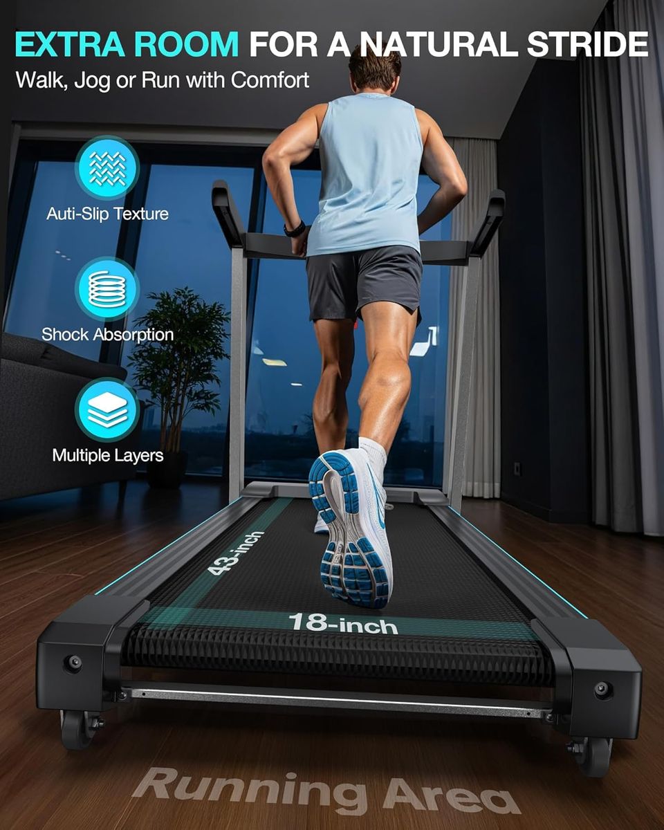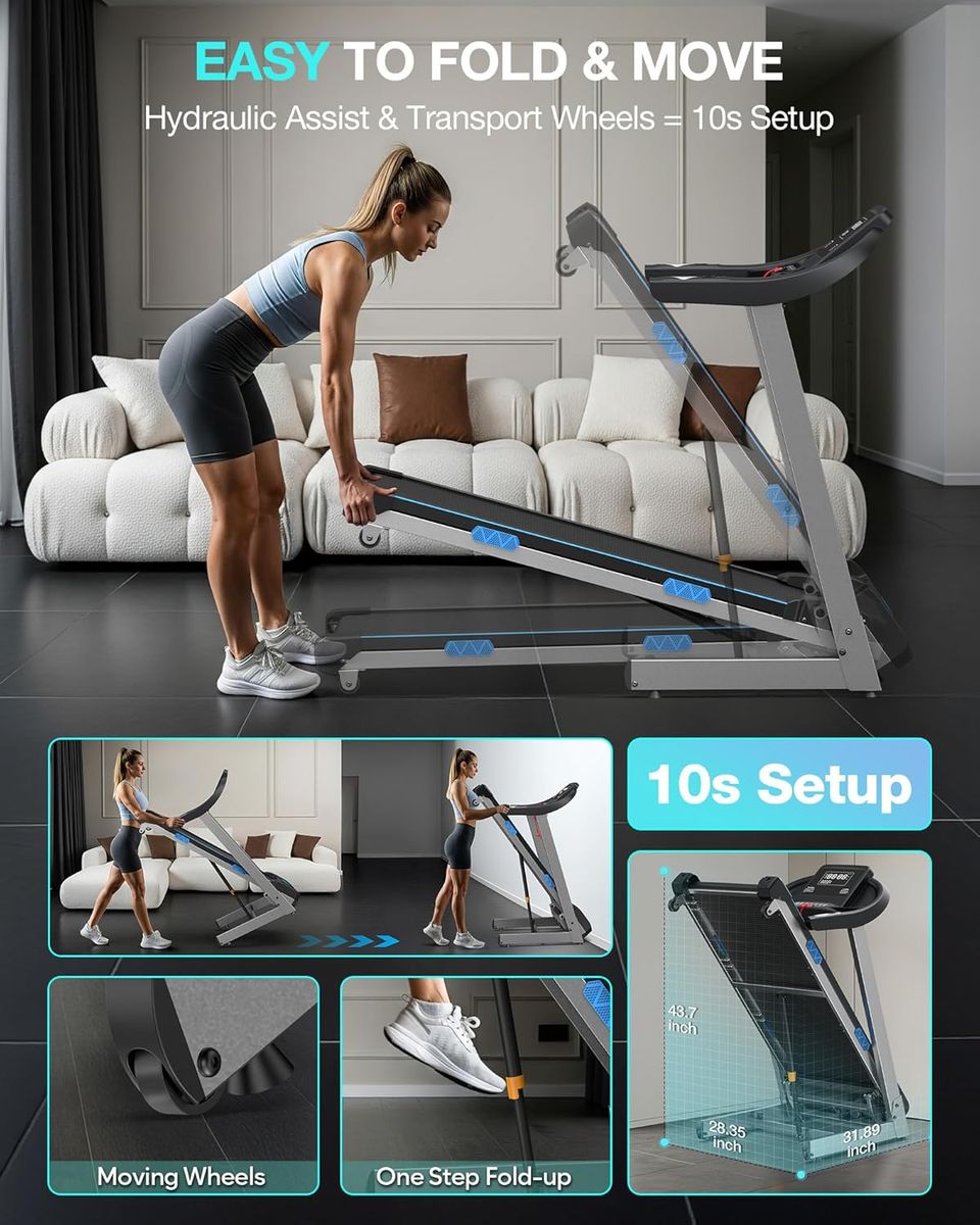 Easy Assembly & Compact StorageArrives 95% pre-assembled—set up in 10 minutes with just 6 screws. This foldable treadmill with transport wheels moves easily and stores flat, ideal for small spaces, apartments, or offices.