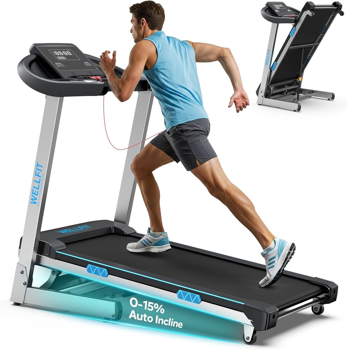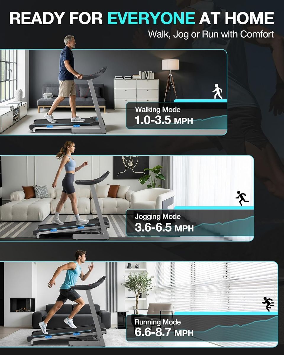 Recommended uses for product Auto Incline Folding Treadmills for Small Spaces. It can be easily folded and stored away when not in use. This feature allows individuals living in tight quarters to enjoy effective workouts without cluttering their living environments., Brisk Walk – 2.6–3.8 MPHPick up the pace to burn more calories and boost heart health. Great for weight loss and energizing mornings., Leisure Walk – 1.0–2.5 MPHGentle pace for under-desk walking, seniors, or post-recovery workouts. Low-impact on joints, perfect for daily movement., Light Jog – 3.9–5.5 MPHIdeal for warm-ups, steady cardio, or beginners stepping into running. Smooth, comfortable strides every time., Run Training – 5.6–7.2 MPHPush your endurance and maintain a challenging pace. Perfect for improving stamina and overall performance., Sprint Mode – 7.3–8.6 MPHHigh-intensity bursts for HIIT and speed training. Heavy-duty stability keeps you safe, even at top speed.Auto Incline Folding Treadmills for Small Spaces. It can be ea… See more